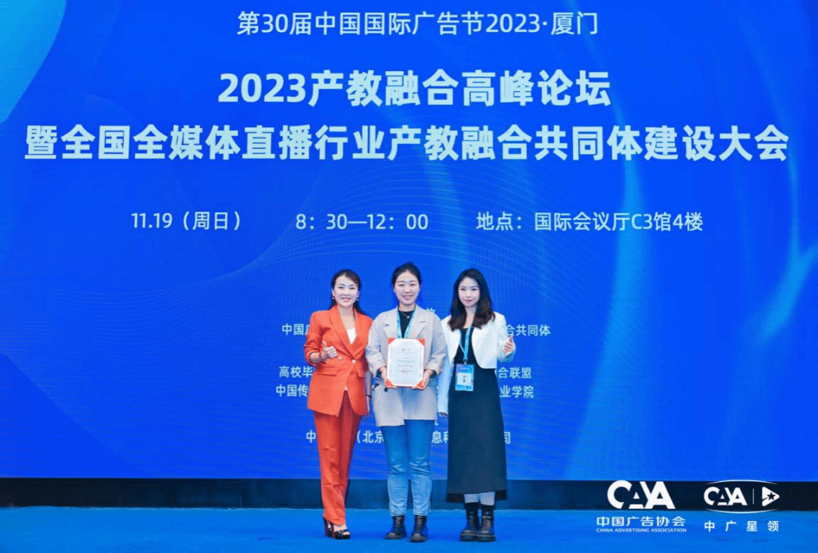 日前,由中国广告协会、全国全媒体直播行业产教融合共同体主办,中广星领(北京)文化信息科技有限公司、中广协产教融合中心承办,高校毕业生就业协会、全国乡村振兴产教融合联盟等单位协办的,2023产教融合高峰论坛暨全国全媒体直播行业产教融合共同体建设大会在厦门召开。文学与传媒学院新闻与传媒系副主任张潇叶、网络与新媒体专业教师杨梦阳应邀参加了本次大会。张潇叶还代表美加墨世界杯官方网站接受了全国全媒体直播行业产教融合共同体常务理事单位聘书。