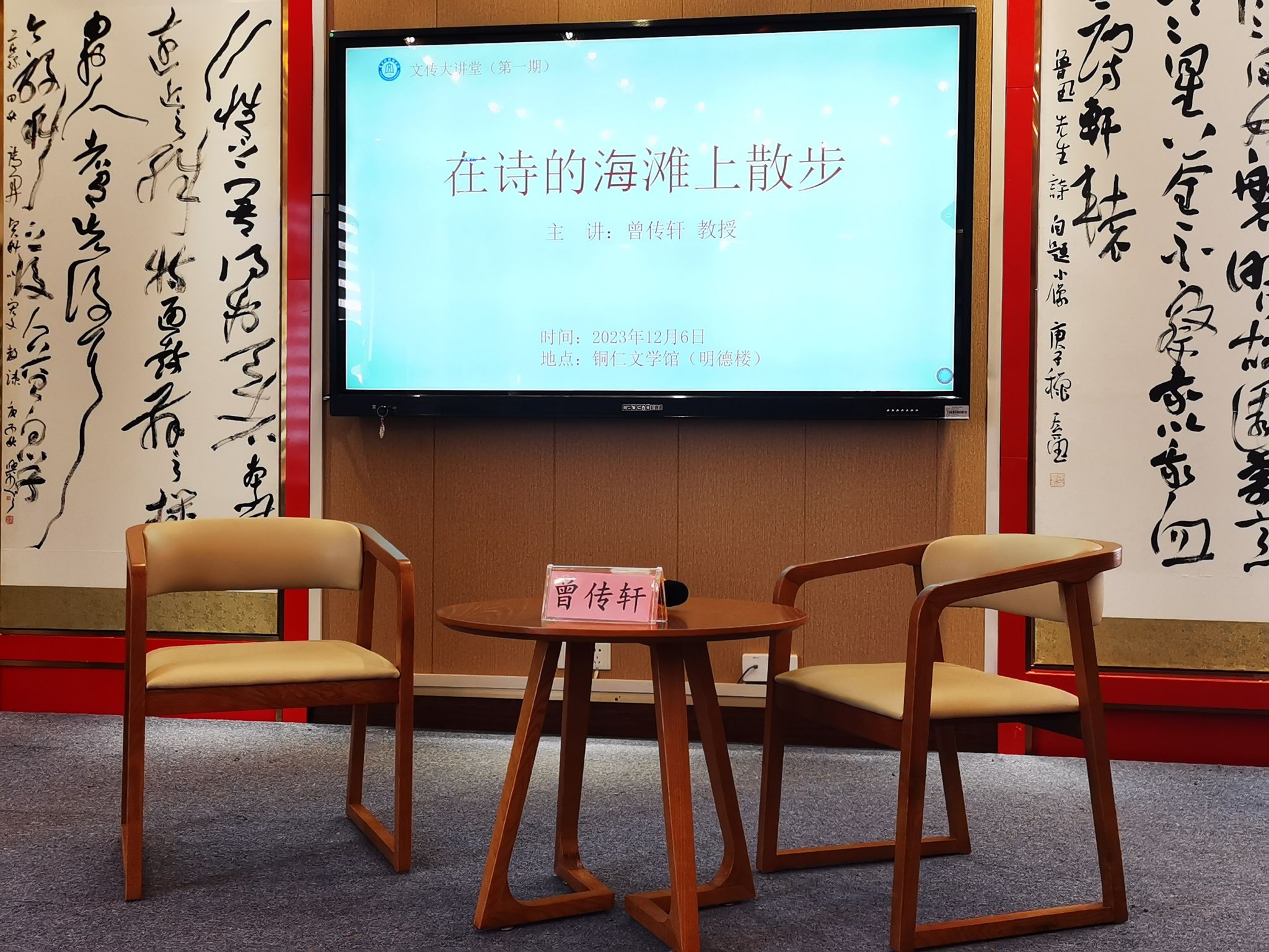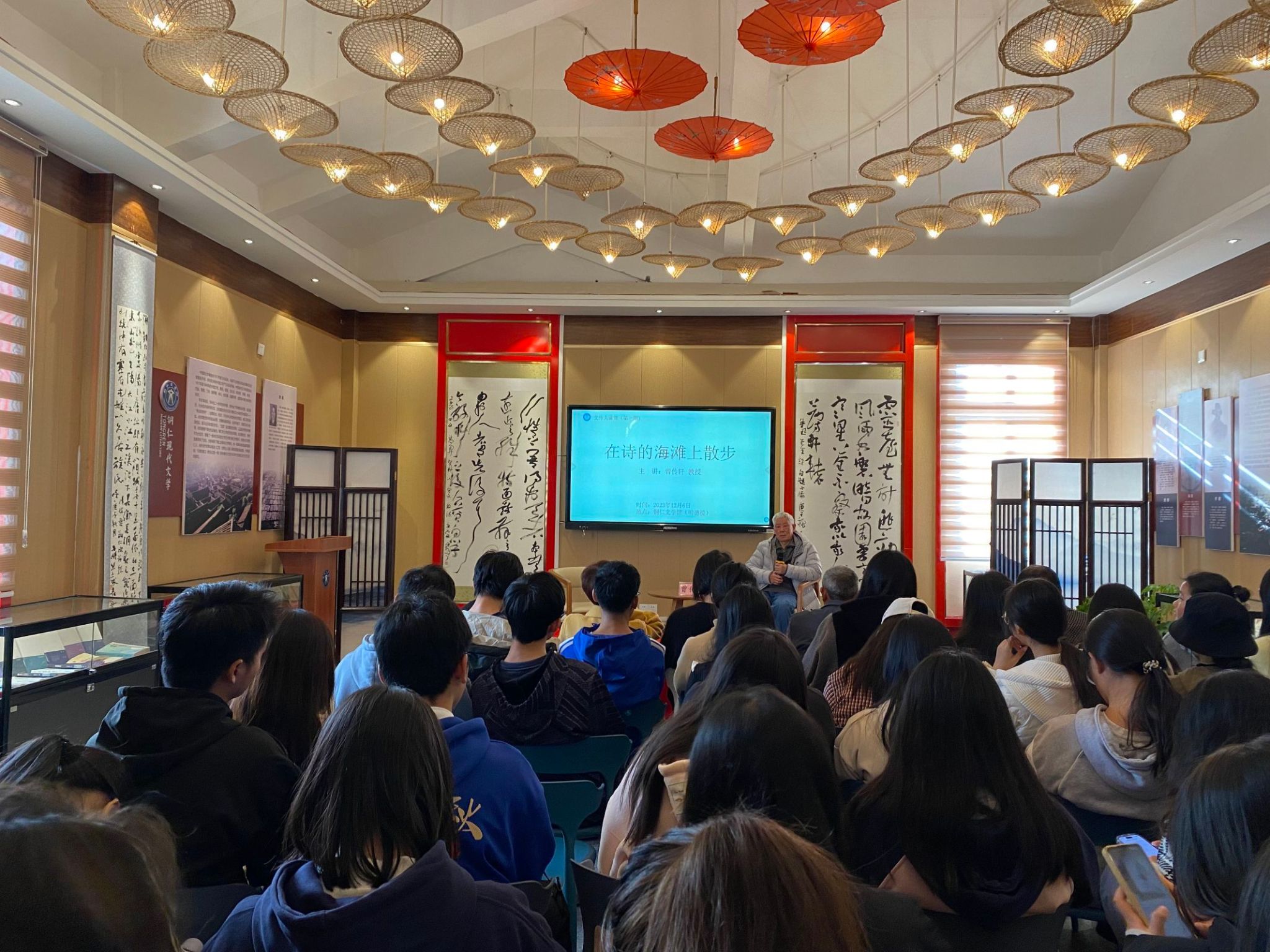 曾老师以《在诗的海滩上散步》为题,采用文学漫谈的形式,以学贯中西、融通古今的文化视野,结合具体文学作品分享了贵州山歌、古典文学、苏联文学和美国民间歌谣中表达的诗意化的语言,并结合自身的读诗经历与同学们分享读诗的感悟。