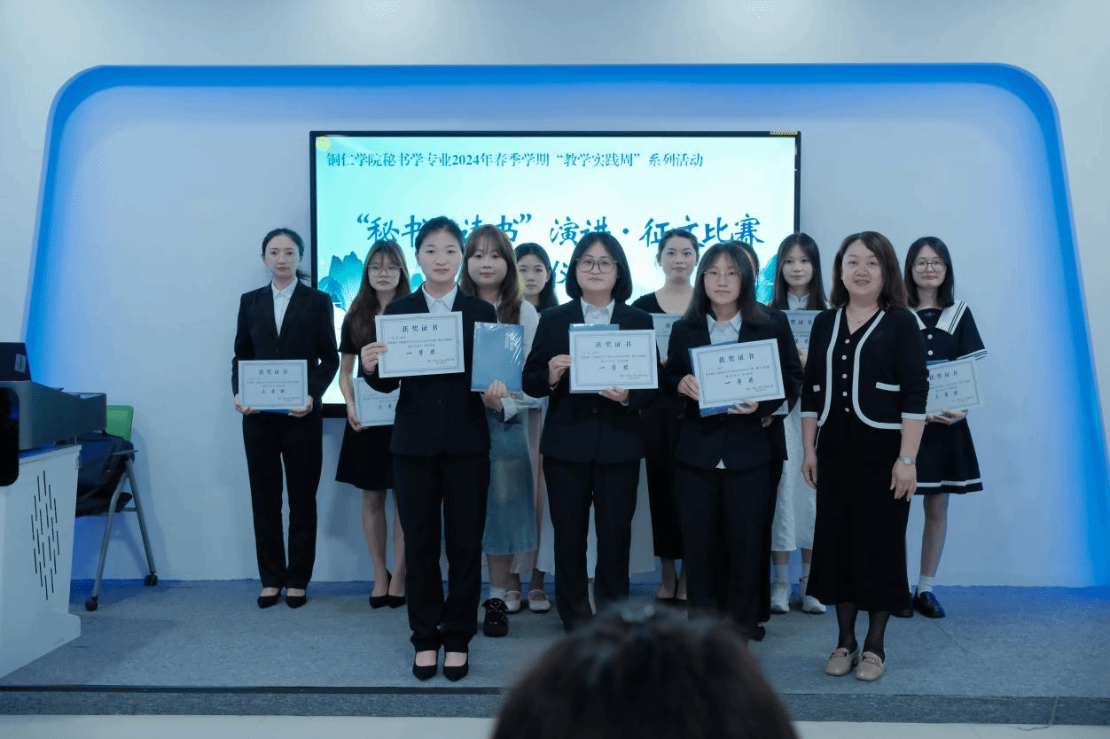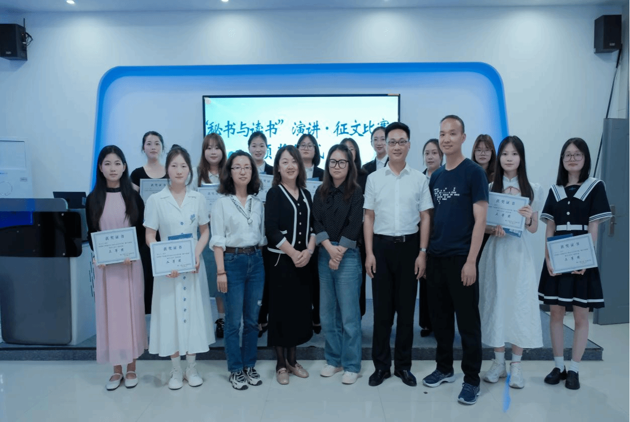 比赛结束后,举行了颁奖仪式。杨雪为刘蕾蕾和此前举行的“秘书与读书”征文比赛一等奖获得者2022级秘书学班王亚、吴寿芳颁发了获奖证书和奖品,何赟、张宇名、侯敏也分别为荣获演讲比赛二等奖、三等奖的同学颁了奖。