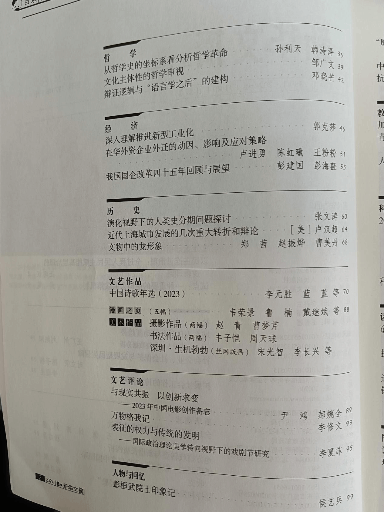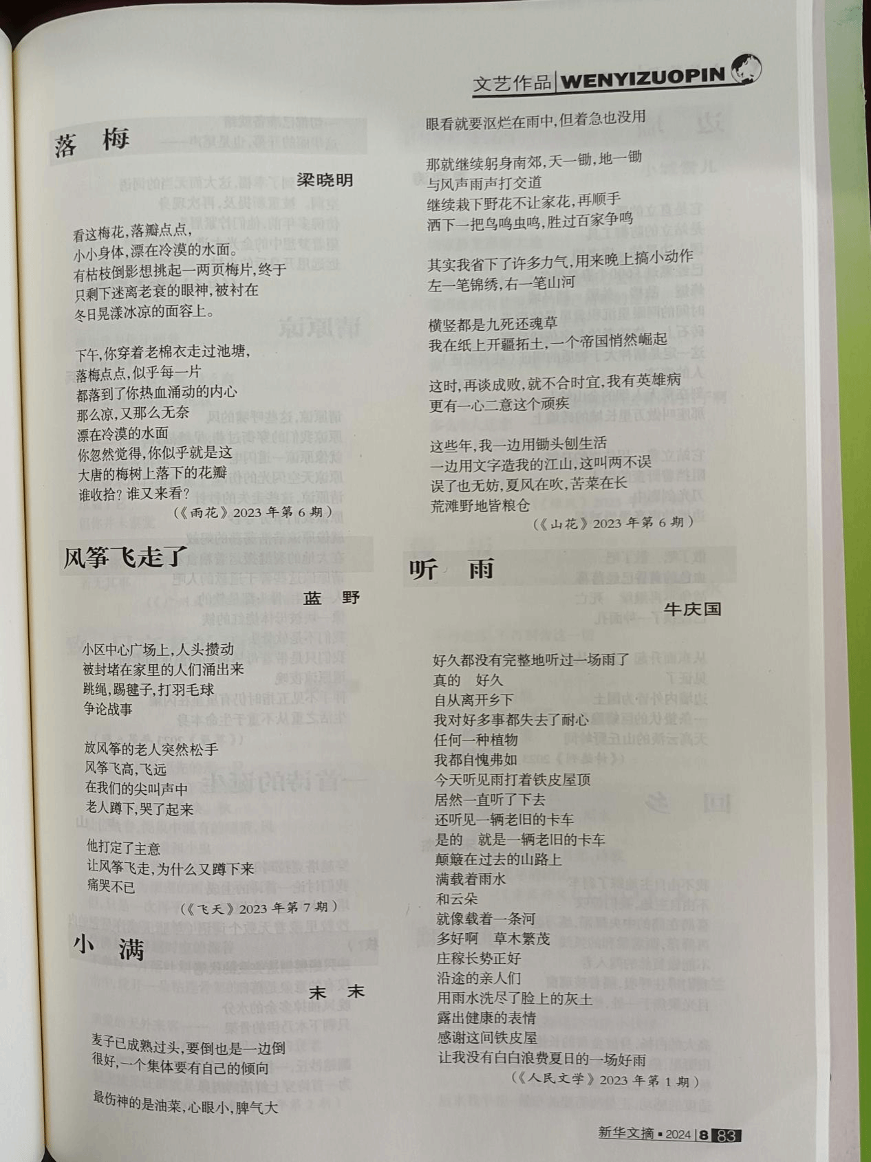 近日,《新华文摘》2024年第8期正式出刊,世界杯官网写作研究院教师王晓旭(末未)创作的诗歌《小满》被转载,该诗歌原载《山花》2023年第6期,曾入选《2023中国年度诗歌》(漓江出版社)。这是世界杯官网教师的文艺作品继王晖之后第二次荣登《新华文摘》。