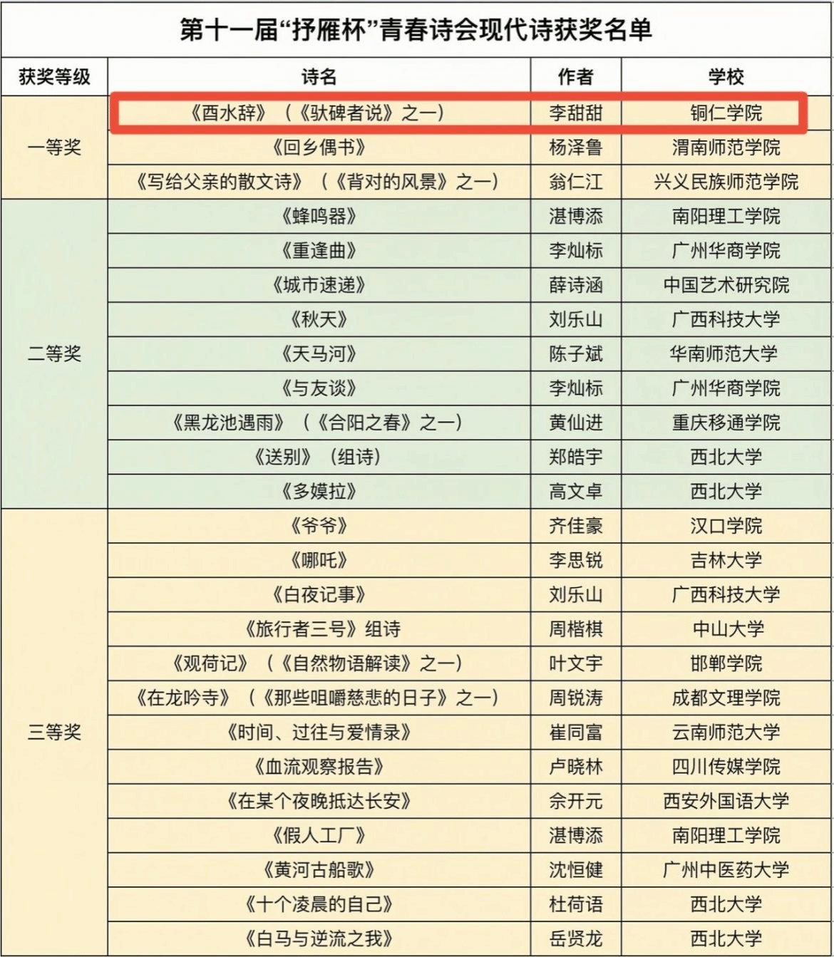 6月6日,第十一届“抒雁杯”青春诗会暨全国大学生诗歌大赛获奖名单正式揭晓,美加墨世界杯官方网站文学与传媒学院2020级汉语言文学专业学生、晨光文学社社员李甜甜的诗歌《酉水辞》(《驮碑者说》之一)从千余首优秀诗歌参赛作品中脱颖而出,斩获现代诗一等奖。