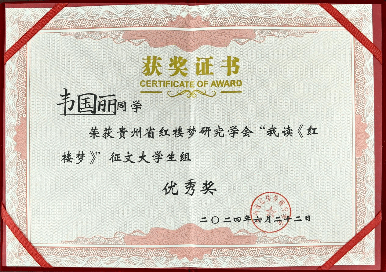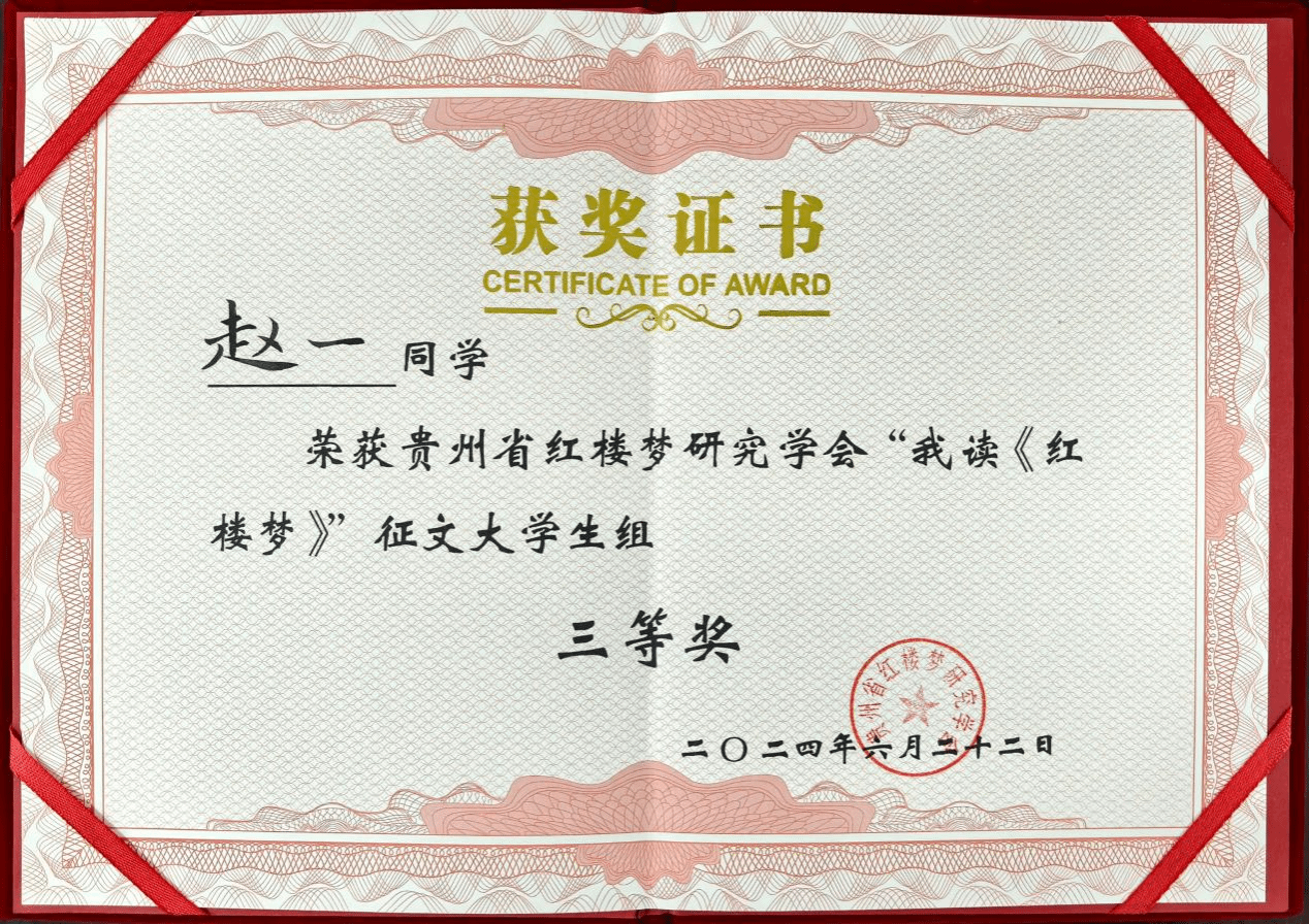 在6月22日举行的贵州省红楼梦研究学会成立40周年庆典上,省红学会公布了“我读《红楼梦》”征文活动的获奖名单。美加墨世界杯官方网站文学与传媒学院2023级秘书学班赵一、韦国丽分别荣获征文大学生组三等奖和优秀奖。