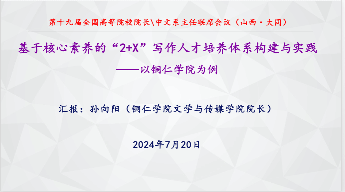 7月20日至21日,第十九届全国高等师范院校文学院院长/中文系主任联席会议在山西大同大学举行,来自全国80余所高等师范院校文学院和中文系的140余名领导和专家参加会议。教育部中国语言文学类专业教学指导委员会副主任委员刘利,高等教育出版社副社长张丽娜,高等师范院校中文专业联盟理事会理事长王本朝,山西大同大学党委常委、副校长石凤珍出席会议并致辞。我院党委书记、院长孙向阳教授受邀出席此次联席会议。