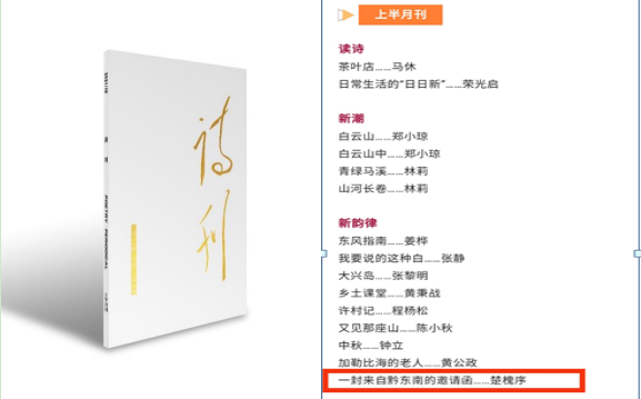 近日,《诗刊》2022年11月号正式发布,我院2022级汉语言文学专业学生楚槐序的诗歌作品《一封来自黔东南的邀请函》列入其中。