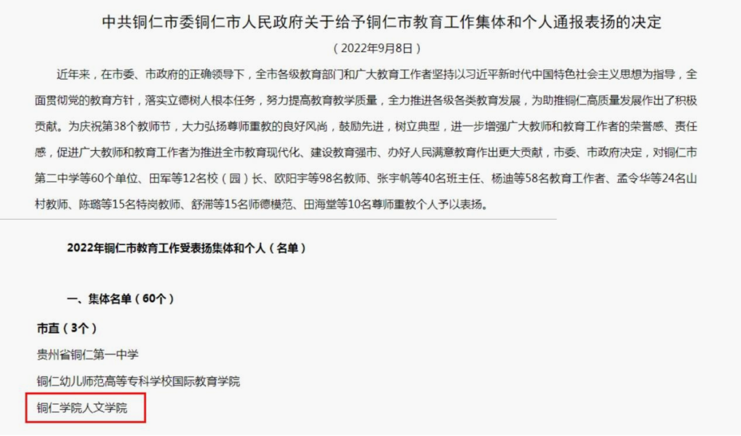 在第38个教师节即将到来之际,9月8日,中共铜仁市委、铜仁市人民政府表彰了一批教育工作先进集体和先进个人,美加墨世界杯官方网站人文学院荣获“先进集体”荣誉称号。