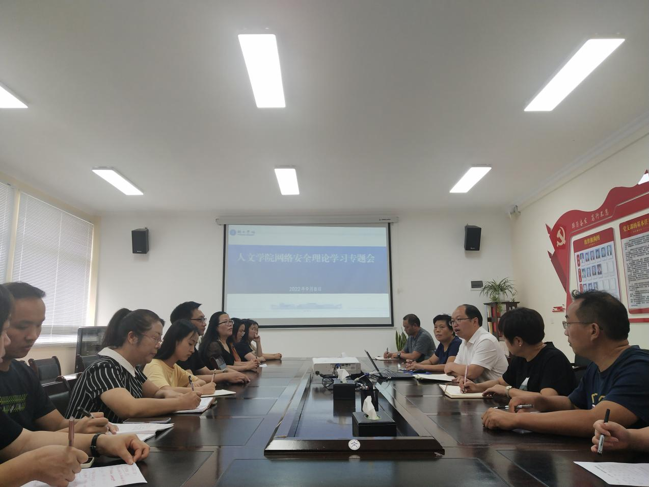 9月8日,人文学院召开网络安全理论学习专题会议。院党委书记、院长孙向阳,院党委委员、副院长张建刚、蒋小红、白俊骞出席会议。院党委副书记杨兴英主持会议,并传达了学校网络安全工作精神。