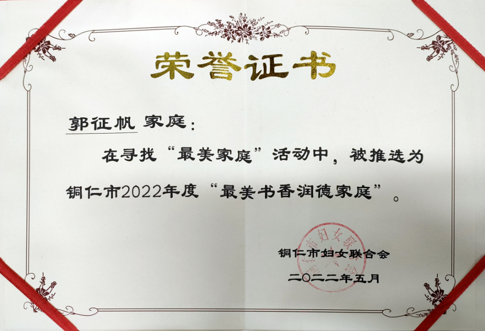 此前,郭征帆家庭还荣获了2022年度铜仁市“最美书香润德家庭”。