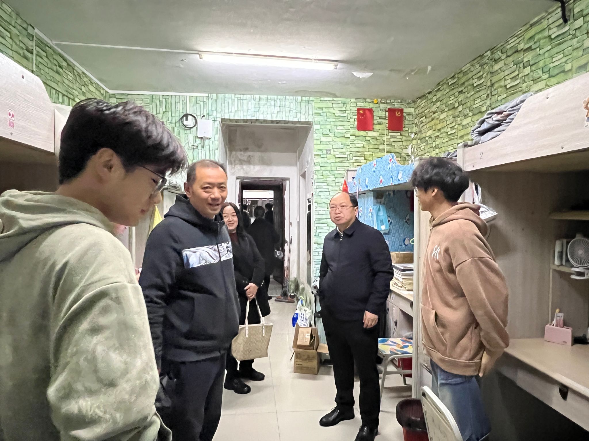 20:10时,院领导带领全体辅导员,分成多个小组深入学生宿舍。他们细致检查寝室设施,对潜在的安全隐患进行排查。排查过程中,领导们耐心询问室友间相处状况,对存在的矛盾纠纷及时了解并跟进解决。此外,老师们还深入了解同学们的课余生活与心理状态,温馨提醒大家注意劳逸结合,保持积极乐观心态,并鼓励大家遇到问题和困难,要主动与老师沟通。