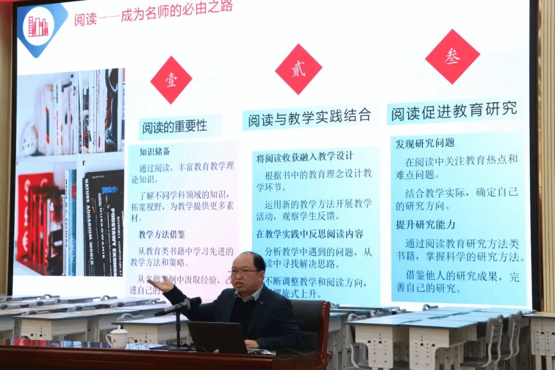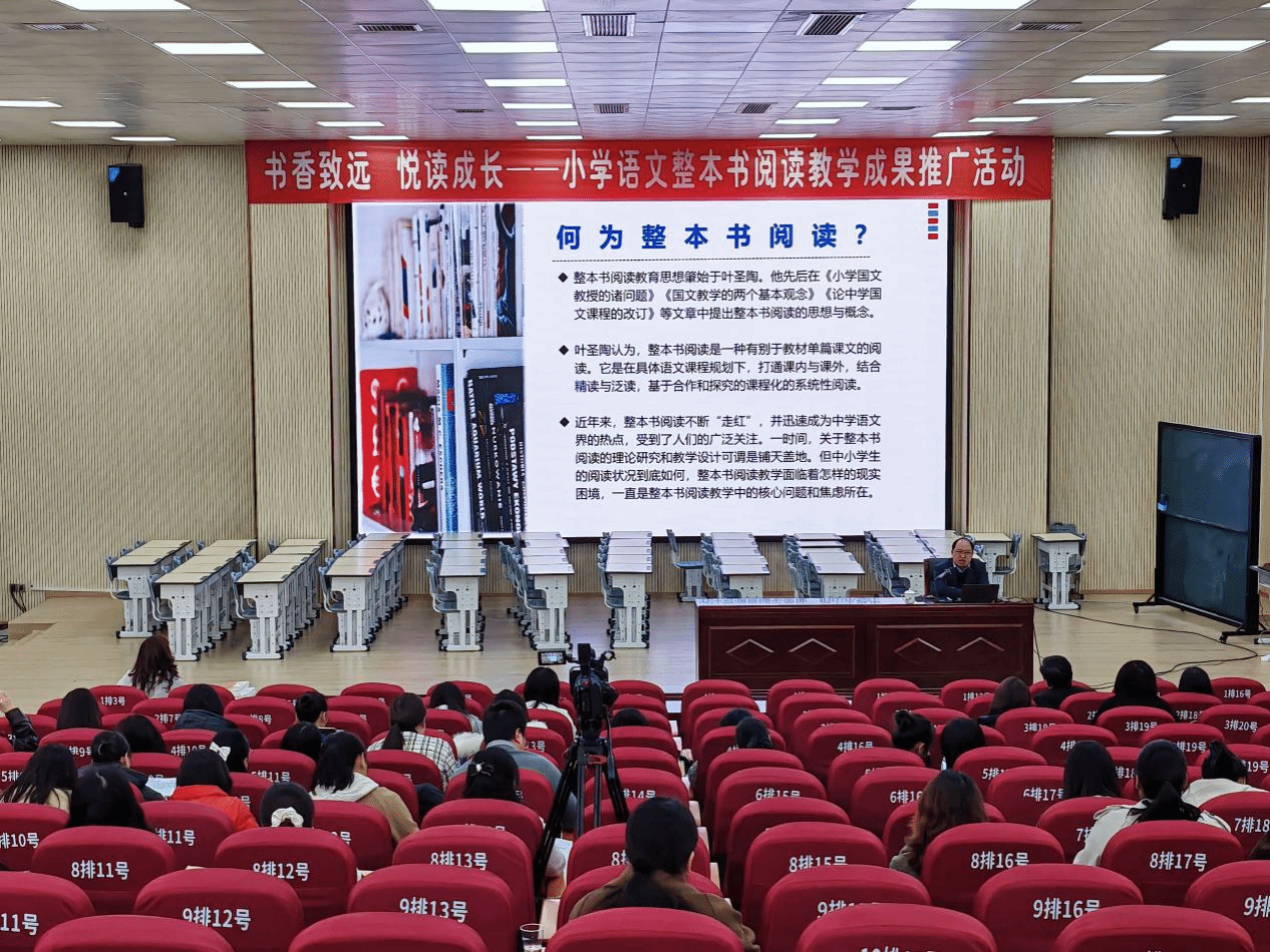 随后,孙向阳围绕2022年版《义务教育语文课程标准》,详细阐述了整本书阅读教学在当代语文教育体系中的重要意义,为教师们深刻理解整本书阅读教学的价值锚定了方向。在剖析整本书阅读教学现状时,从“积极”与“问题”两个维度展开,既肯定了当前教育界在整本书阅读推广方面的努力与成效,也精准指出了存在的诸如教学目标模糊、阅读指导缺乏系统性等问题。他凭借丰富的教育经验与深入的研究成果,从制定阅读计划、指导阅读方法、开展课内阅读活动以及课外阅读活动四个关键方面,为教师们提供了一套系统且极具实操性的整本书阅读教学指导策略。他强调,科学合理的阅读计划是引导学生有序阅读的基础,多元化的阅读方法能够满足不同学生的阅读需求,而丰富多样的课内与课外阅读活动则是激发学生阅读兴趣、巩固阅读效果的重要保障。他希望一线的教师们,一定要多读书,好读书,读好书,通过广泛阅读不断提高教学水平与研究能力,以自身的阅读热情与良好阅读习惯感染并带动学生,为学生树立终身阅读的榜样。让读书成为习惯,让阅读成就梦想。