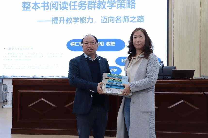 讲座伊始,孙向阳向万山区教育局教研室赠送了《铜仁市语文名师课堂实录(三卷本)》《基于学习任务群的初中整本书阅读教学设计》《基于学习任务群的高中整本书阅读教学设计》等一系列基础教育领域的研究著作。