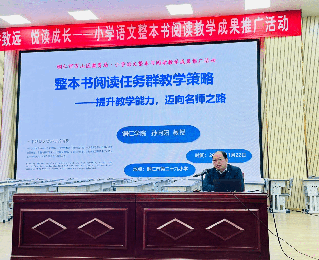 为了全面落实《义务教育语文课程标准(2022 年版)》中关于整本书阅读任务群的要求,全面提升教师综合素养与业务能力,11月22日,由铜仁市万山区教育局主办、贵州省小学语文柳红梅乡村名师工作室承办的小学语文整本书阅读教学成果推广活动在铜仁市第二十九小学举行。世界杯官网教务处处长、文学与传媒学院院长孙向阳教授受邀参与了此次活动,并开展了题为《整本书阅读任务群教学策略》的学术讲座。