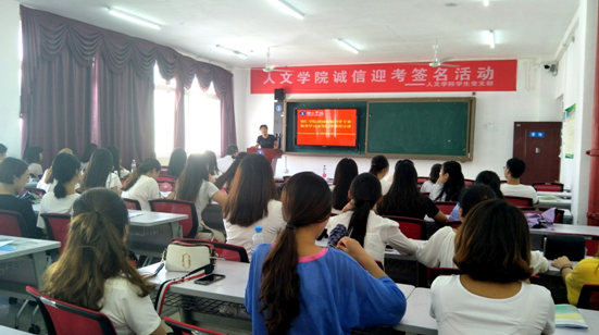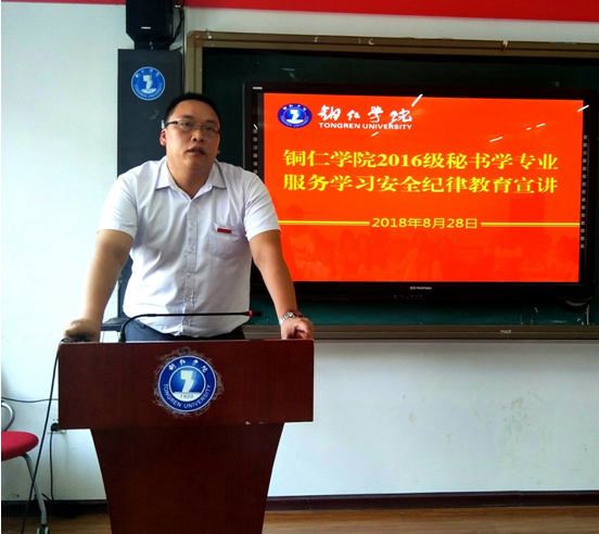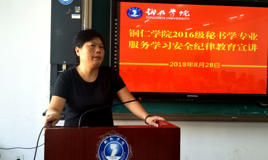 8月28日下午,我院服务学习安全纪律教育宣讲会在依仁楼A305教室召开。副院长、服务学习工作领导小组副组长杨兴英出席宣讲会,第一批参与服务学习的2016级秘书学班全体学生参加了会议。宣讲会由院学生发展科科长冉显礼主持。