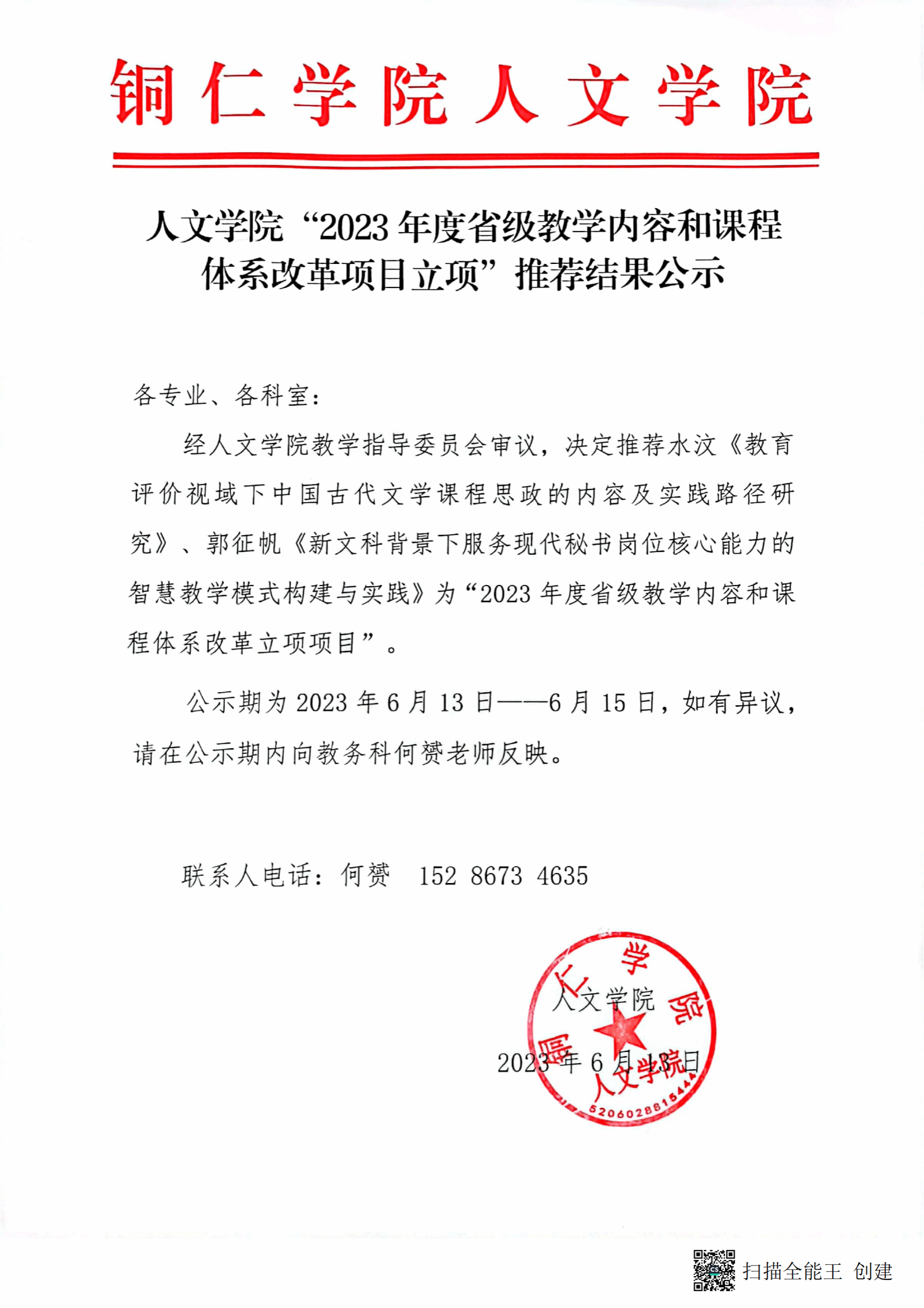 人文学院“2023年度省级教学内容和课程体系改革项目立项”推荐结果公示
