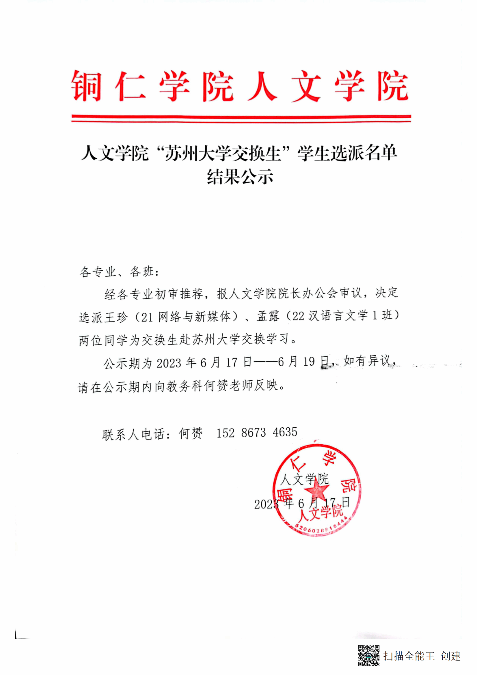 人文学院“交换生赴贵州大学交换学习” 推荐结果公示