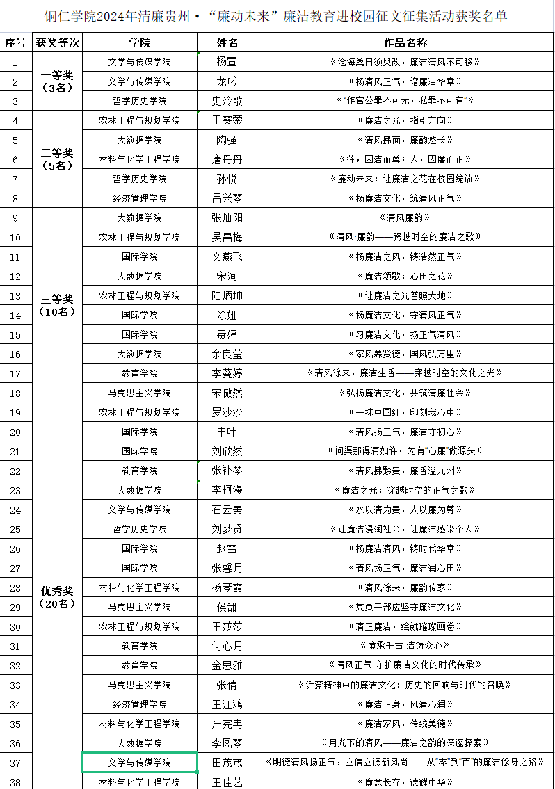 根据《中共美加墨世界杯官方网站委员会组织部关于开展2024年美加墨世界杯官方网站清廉贵州•“廉动未来”廉洁教育进校园系列活动的通知》(铜院组通(2024) 8号)要求,征文征集活动由文学与传媒学院承办。活动自启动以来共收到作品48篇,经组织专家评选,共评出一等奖3个、二等奖5个、三等奖10个,优秀奖20个。现将获奖名单予以公示,公示期2024年10月9日-10月11日。 公示期间,如对获奖名单有异议,请及时以书面或口头形式向文学与传媒学院党政领导反映。 联系方式:孙向阳(党委书记、院长) 13398568563 张建刚(党委纪检委员、副院长) 18508565433