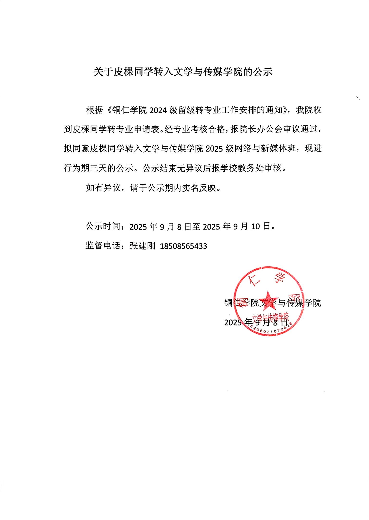 关于皮棵同学转入我院的公示