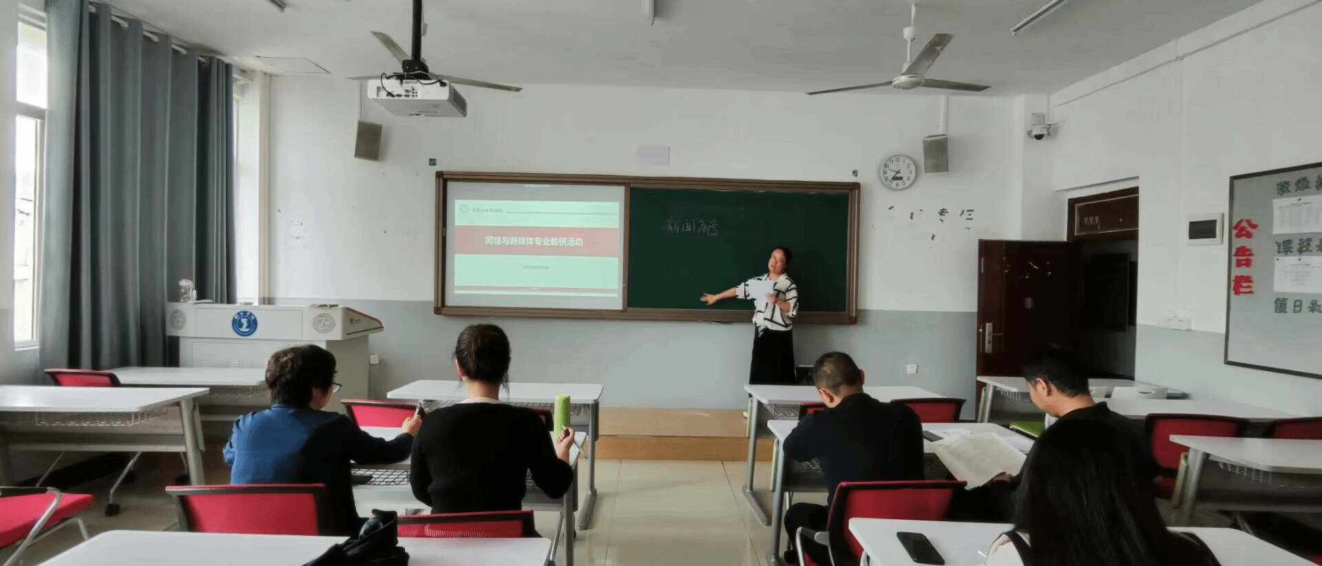 活动开始前,新闻与传媒系副主任张潇叶在智慧教室为全体教师进行了智慧教室设备操作培训,讲解了设备的使用方法及直播、录课等功能的实操步骤。随后,网络与新媒体专业教师们分教室开展了磨课活动。老师们磨目标,磨重难点,磨课件,全方位把控课堂主要教学环节,磨课成效得到体现。