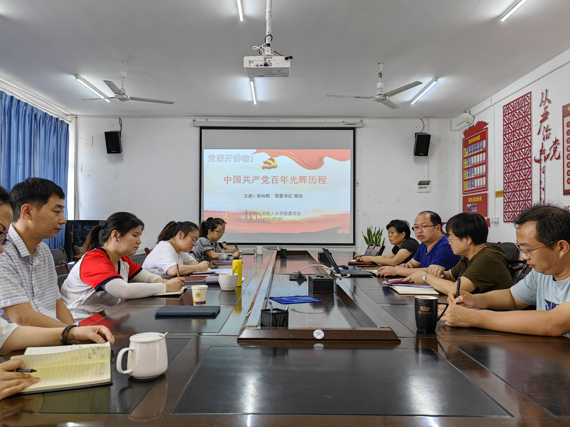 7月7日,时值建党101周年,人文学院党委书记为教师党员上了一堂题为“中国共产党百年光辉历史 ”的党课,院党委委员、各科室负责人、各系主任和各党支部书记参加学习。