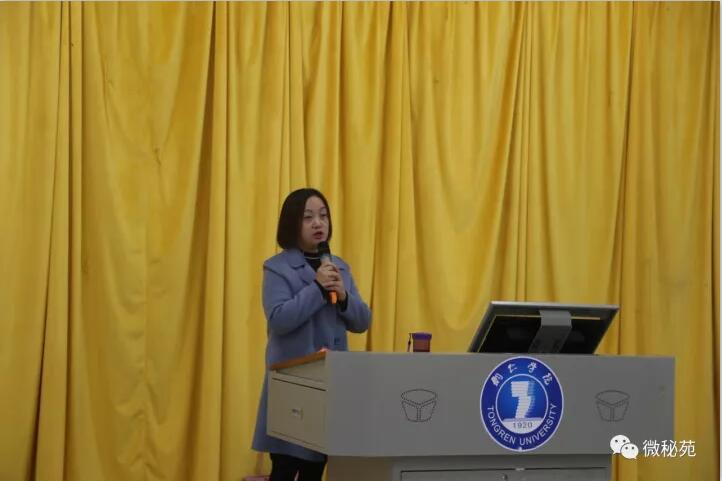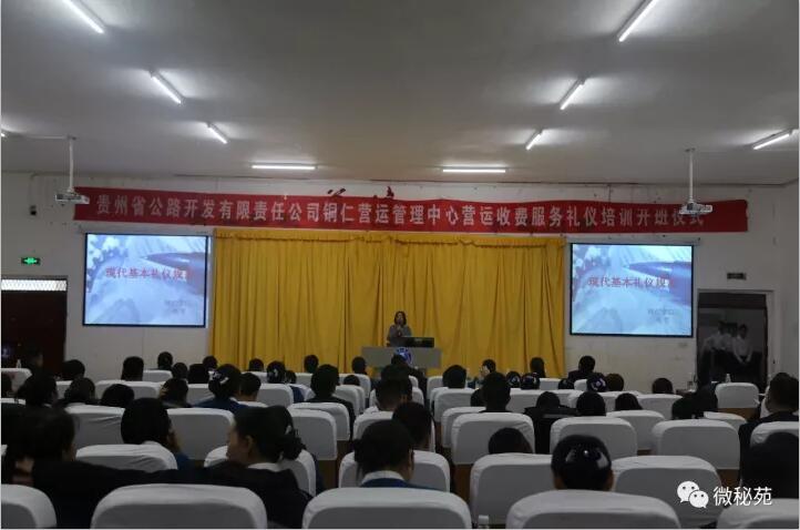 11月16日上午,贵州省公路开发有限责任公司铜仁营运管理中心员工营运收费服务培训班在美加墨世界杯官方网站博思楼206教室举行开班仪式,仪式过后即举行了礼仪知识培训。培训旨在进一步规范员工礼仪,提升个人修养及岗位意识,提高工作能力及服务水平,塑造良好企业形象。秘书学教研室教师、全国商务秘书职业技能大赛评委杨雪为培训班140余名学员授课。