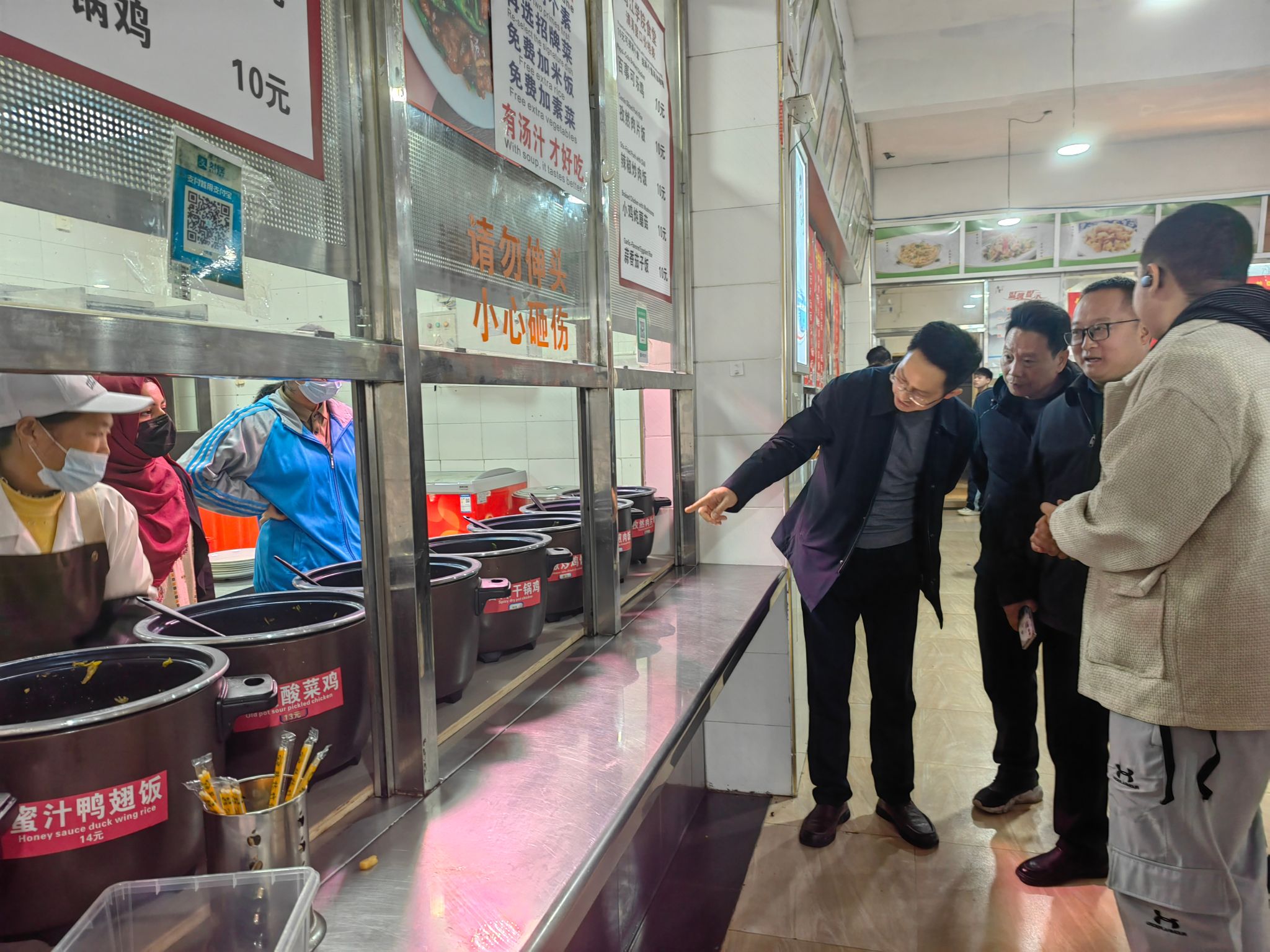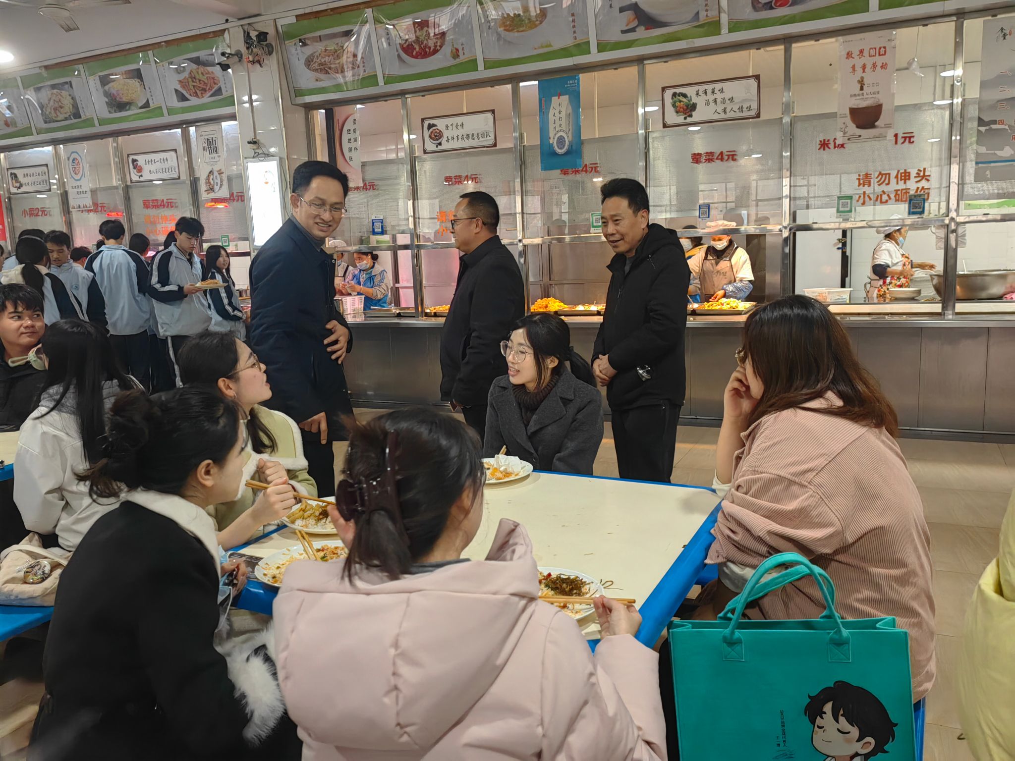 鲁道旺、肖庭华一行深入食堂后厨、用餐区等区域,细致了解食材采购、食品加工、环境卫生、菜品供应及价格等情况,认真听取乌江学院在餐饮服务、基础设施维护等方面存在的实际困难与意见建议。在食堂现场,他们与正在用餐的研究生志愿者及留学生进行了亲切交谈,仔细询问同学们对饭菜口味、种类、价格以及日常学习生活服务等方面的感受与需求,并对同学们参与志愿服务、积极融入校园生活表示赞许。