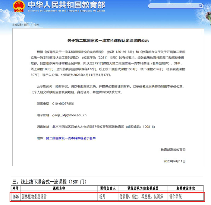 近日,教育部发布了《关于第二批国家级一流本科课程认定结果的公示》,世界杯官网农林工程与规划学院教师杨月、付素静、杨红、邱发根、包润泽、杨忠华团队负责的课程《园林植物景观设计》榜上有名!这是世界杯官网首次入围国家级一流本科课程。