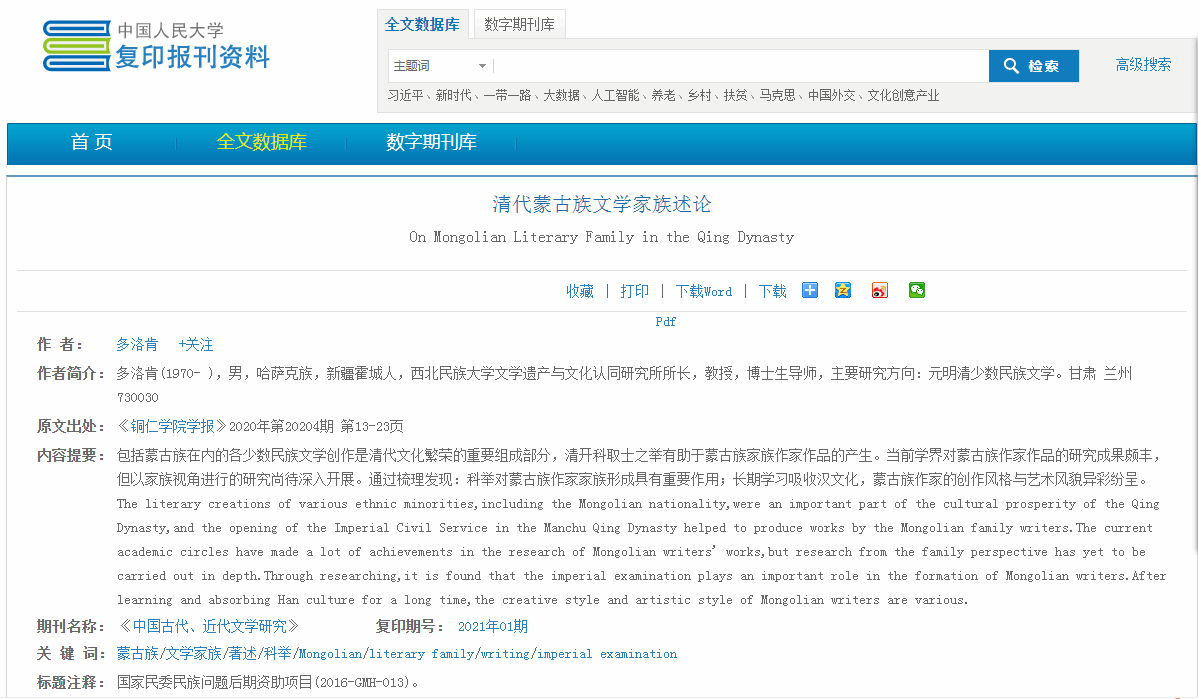 《美加墨世界杯官方网站学报》2020年第4期刊发的多洛肯教授所著《清代蒙古族文学家族述论》一文被中国人民大学书报资料中心复印报刊资料《中国古代、近代文学研究》2021年第1期全文转载。