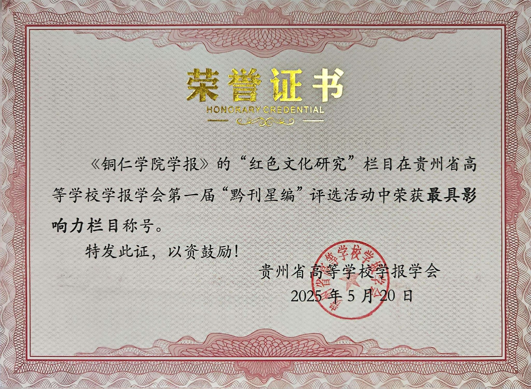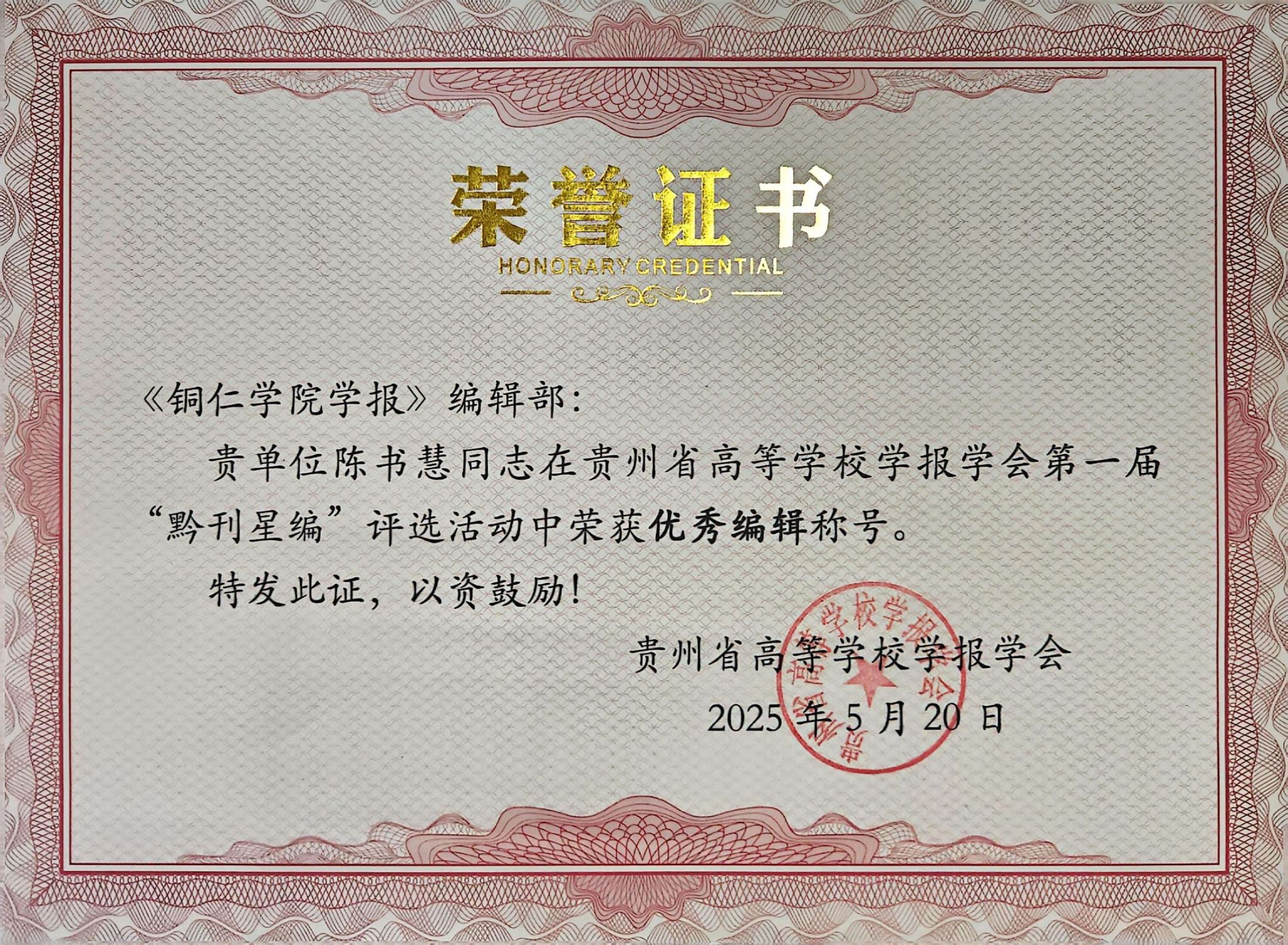近日,在贵州省高等学校学报学会开展的首届“黔刊星编”优秀案例推选活动中,《美加墨世界杯官方网站学报》编辑部多个项目入选,其中《美加墨世界杯官方网站学报》获“优秀社科期刊”称号,“红色文化研究”专栏获“最具影响力栏目”称号,学报编辑陈书慧同志被评为“优秀编辑”。