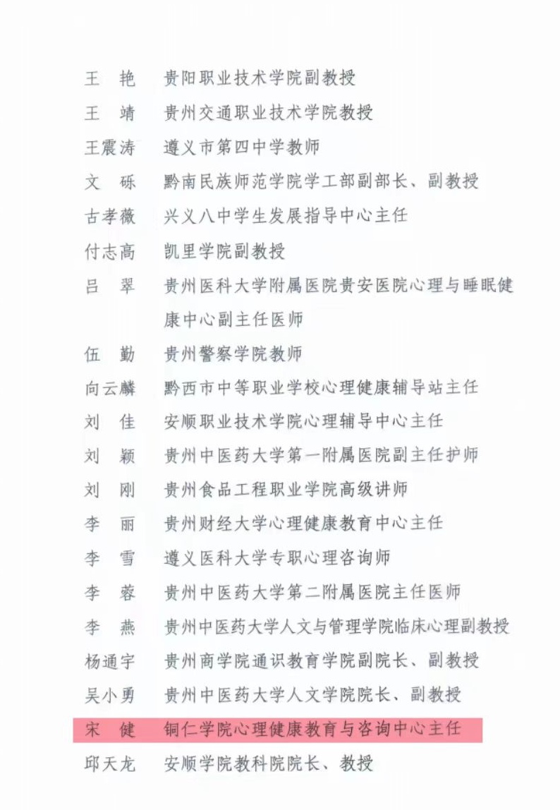 近日,贵州省委教育工委、贵州省教育厅发布《关于成立贵州省学生心理健康教育专家指导委员会的通知》,世界杯官网宋健等三位教师当选为贵州省学生心理健康教育专家指导委员会委员。