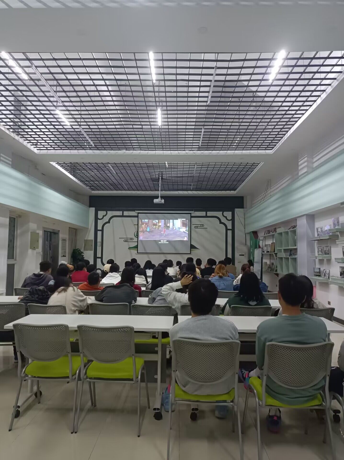 接着,由分享者为同学们播放时长为一个多小时的电影—《寻梦环游记》。影片故事围绕一个墨西哥乡下男孩儿米格展开:米格热爱音乐,但他的曾曾祖父为了音乐抛妻弃女、远走他乡,曾曾祖母为此将音乐视为诅咒,禁止家族里的人接触音乐。一场意外让米格穿越到了亡灵之国,米格想方设法回到现实的过程中碰巧揭开了曾曾祖父当年抛妻弃女背后秘密的故事。在播放影片的过程中,同学们一边欢笑连连,一边认真地观看影片,并且思考着分享者给出的问题的答案。