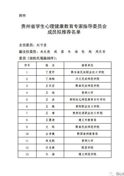4月11日,贵州省教育厅发布了《省教育厅关于贵州省学生心理健康教育专家指导委员会成员拟推荐名单的公示》,根据《省教育厅办公室关于推荐贵州省学生心理健康教育专家指导委员会成员的通知》要求,经学校推荐,专家推选,拟推荐贵州师范大学赵守盈、贵州大学冉龙彪等54位同志为贵州省学生心理健康教育专家指导委员会成员,拟推荐赵守盈同志担任主任委员,冉龙彪、宛蓉、朱海、张翔、周庆菊等5位同志担任副主任委员。世界杯官网心理健康教育中心主任宋健、学工部部长张钱入选,另外世界杯官网大健康学院教师陈方超作为铜仁市教育局专家入选。