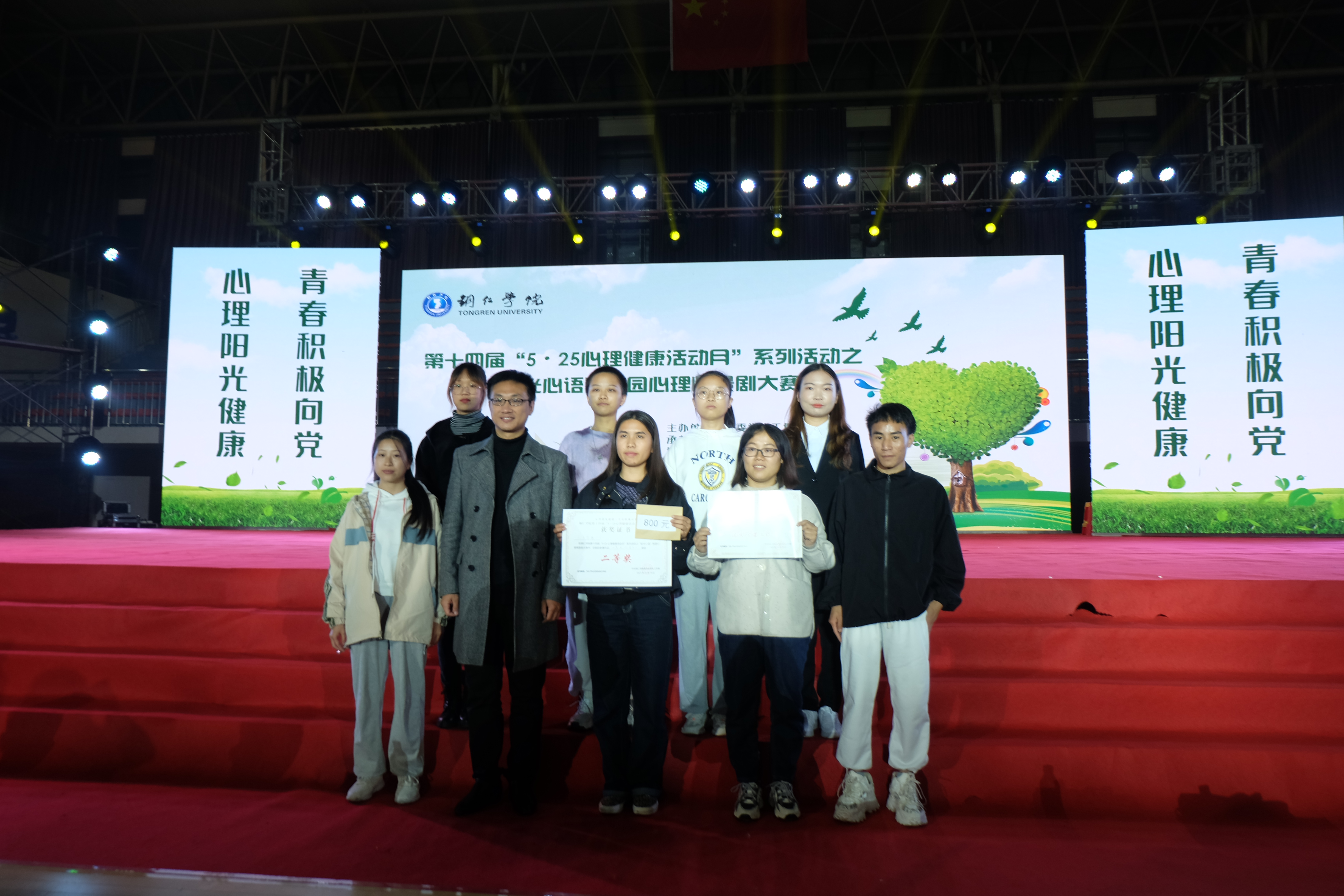 经过紧张激烈角逐,教育学院获一等奖,人文学院、乌江学院获二等奖,国际学院、马克思主义学院、大数据学院或三等奖,来自乌江学院的冯羽同学获得最佳表演奖,来自教育学院的田彩玲同学获得最佳人气奖。相关领导现场为获奖学院和个人颁奖,并为获得本届“5·25心理健康活动月”系列活动之“一站一品”优秀特色品牌活动获奖学院现场颁奖。