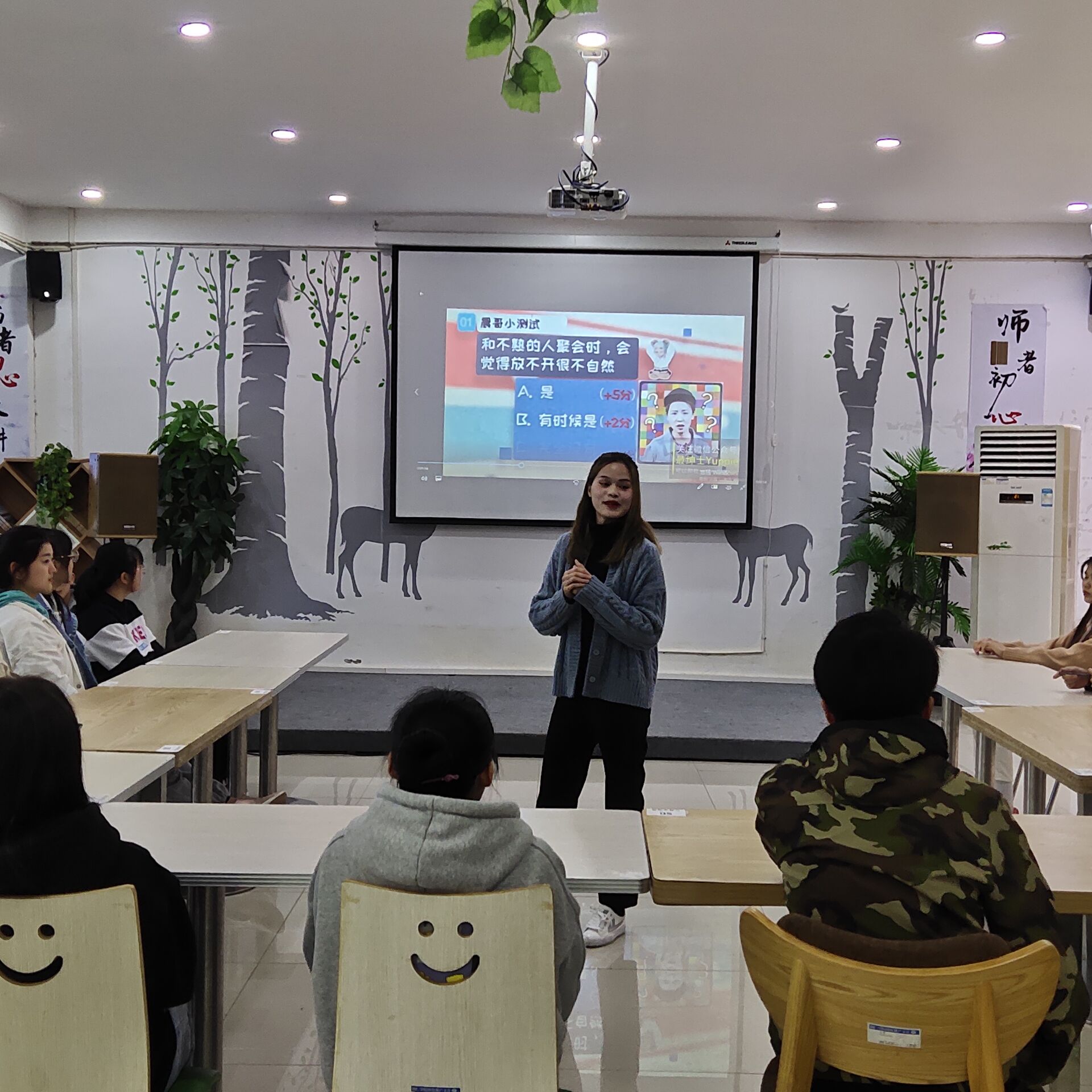 活动开始前,主持人通过亲身经历巧妙的引导出了本期的主题社交恐惧症,在主持人的带动下现场的同学们也积极的参与其中,并与主持人积极沟通并分享了自身的看法。主持人通过一个短视频让同学们测试自己是否存在社交恐惧症,使同学们对自身有了更深的认识。