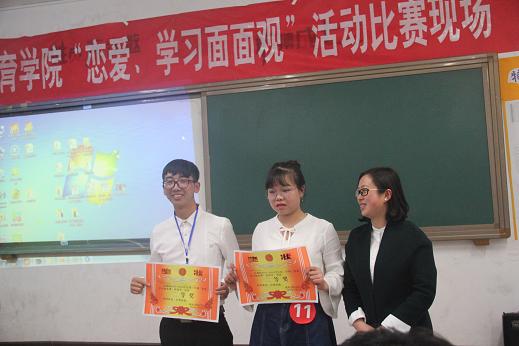 比赛结束后,宋健老师对该活动开展作了点评,他高度肯定了此次活动的意义,并表达了对该院今后在开展此类活动的期待。随后于慧慧老师从恋爱学习心理方面对此次活动进行了总结,并对比赛流程提出了建设性建议。最后,评委老师分别为获奖的个人及集体颁奖。至此,本次活动圆满结束。