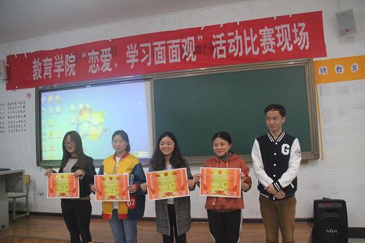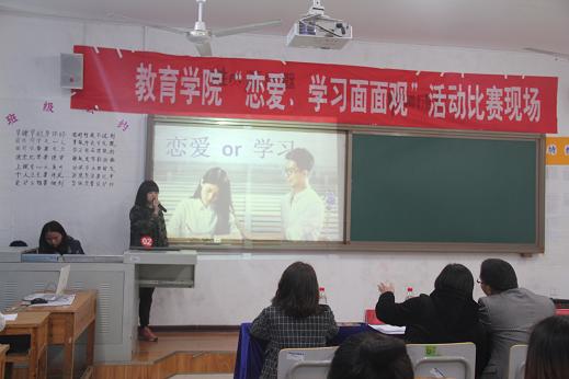 为了解同学们在大学期间的恋爱观与学习观,帮助其树立正确的恋爱观,3月27日下午,世界杯官网教育学院在明理楼B408教室举办“恋爱、学习面面观”主题展示比赛。担任此次比赛的评委有校心理健康教育中心主任宋健、该院公共教研室主任于慧慧、心理工作站常务副站长赵梅玲、团总支负责人文乙皓以及该院心理健康部干事王晓红。来自该院各班级的22支队伍参赛,比赛由学生主持。