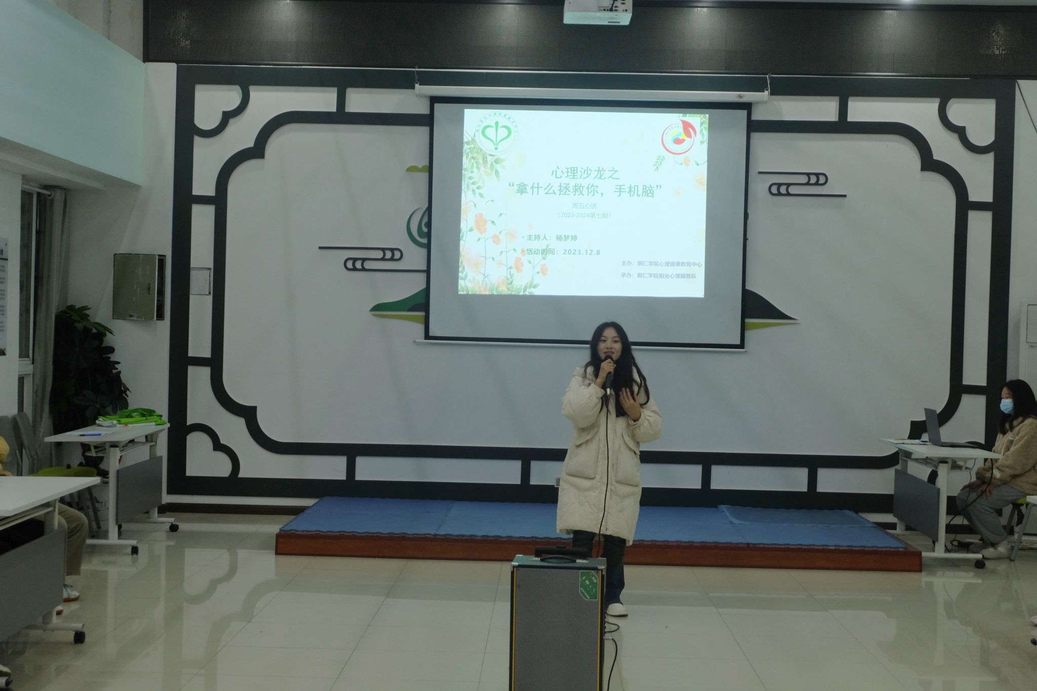12月8日晚,世界杯官网心理健康教育中心在多功能室开展了2023-2024学年第七期周五心语活动——心理沙龙之“拿什么拯救你,手机脑”。此次活动由2023级网络与新媒体班杨梦婷同学主持,共有40名来自不同学院的同学参加。