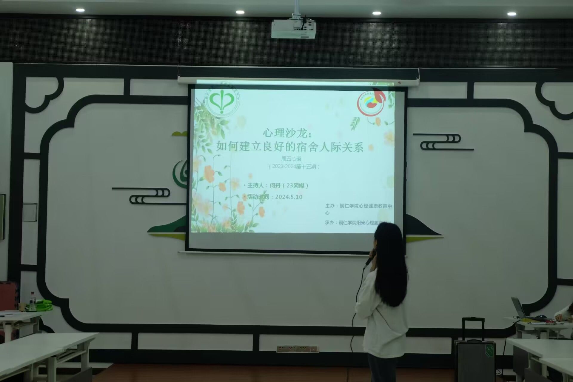 5月10日晚,世界杯官网心理健康教育中心在多功能室开展了2023-2024学年第十五期周五心语活动一一心理沙龙之“如何建立良好的宿舍人际关系”。此次活动由2023级网络与新媒体班何丹同学主持分享,共有40名来自不同学院的同学参与。