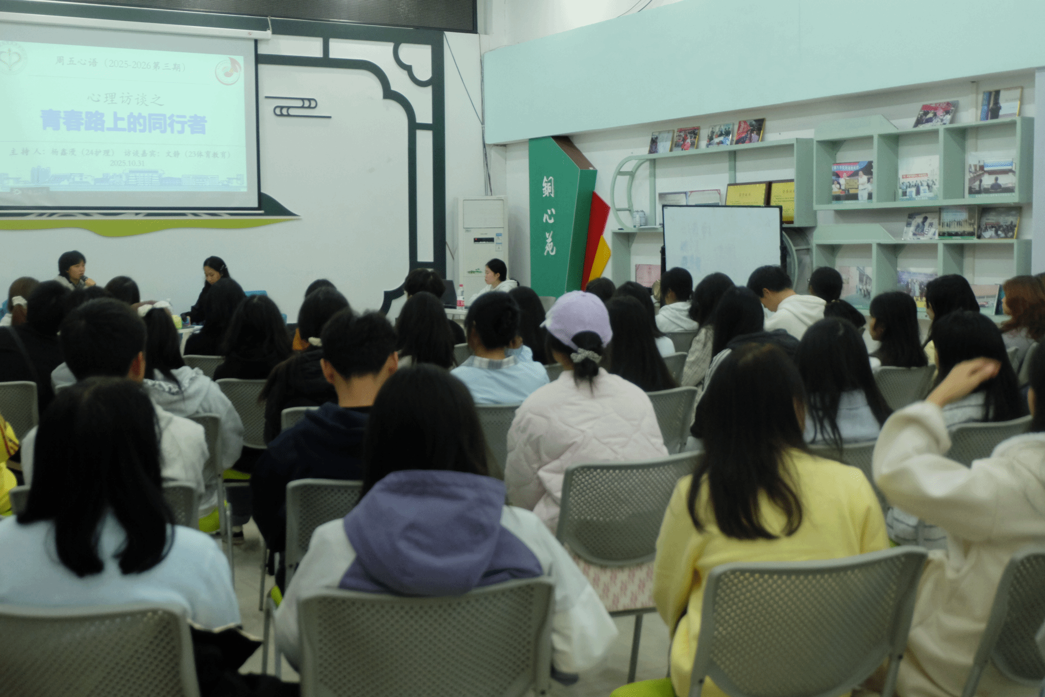 10月31日晚,世界杯官网心理健康教育中心在多功能室举办2025-2026学年第三期“周五心语”活动——心理访谈之“青春路上的同行者”。本次活动由2024级护理学班杨鑫漫同学主持,特邀2023级体育教育2班文静同学作为访谈嘉宾,来自不同学院的50余名同学共同参与。