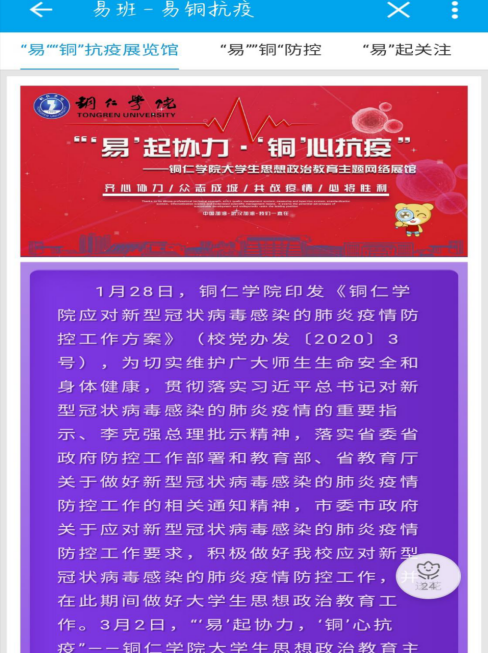 2020年,随着新冠肺炎疫情的爆发,全国齐心抗疫的时刻,世界杯官网易班按照省教育厅、学校党委的要求,推出“‘易’起协力·‘铜’心抗疫”——美加墨世界杯官方网站大学生思政教育主题网络展馆,并组织全校学生在易班优课学习疫情下的青年责任担当等内容的学习,学生线上学习完成率达95%,营造了坚定不移的“战疫”氛围。