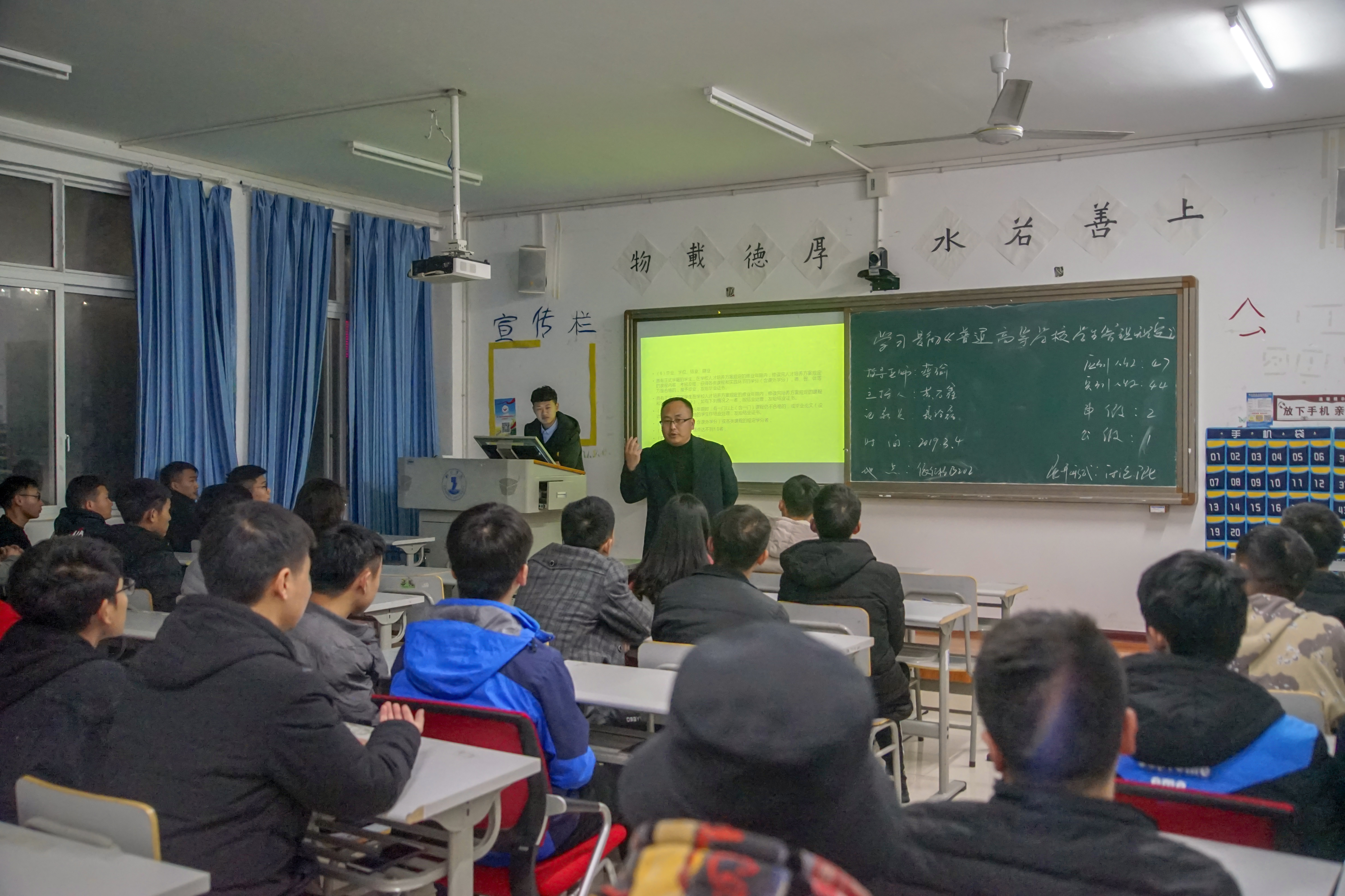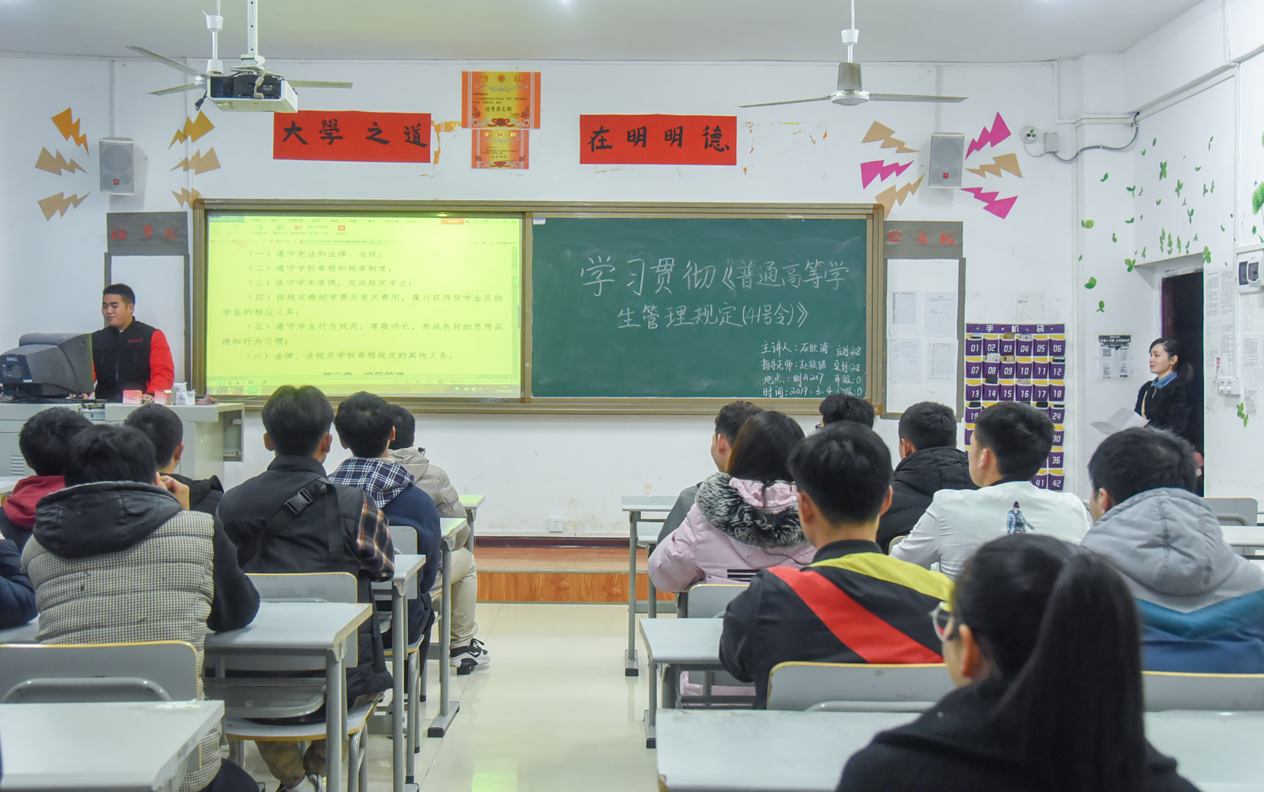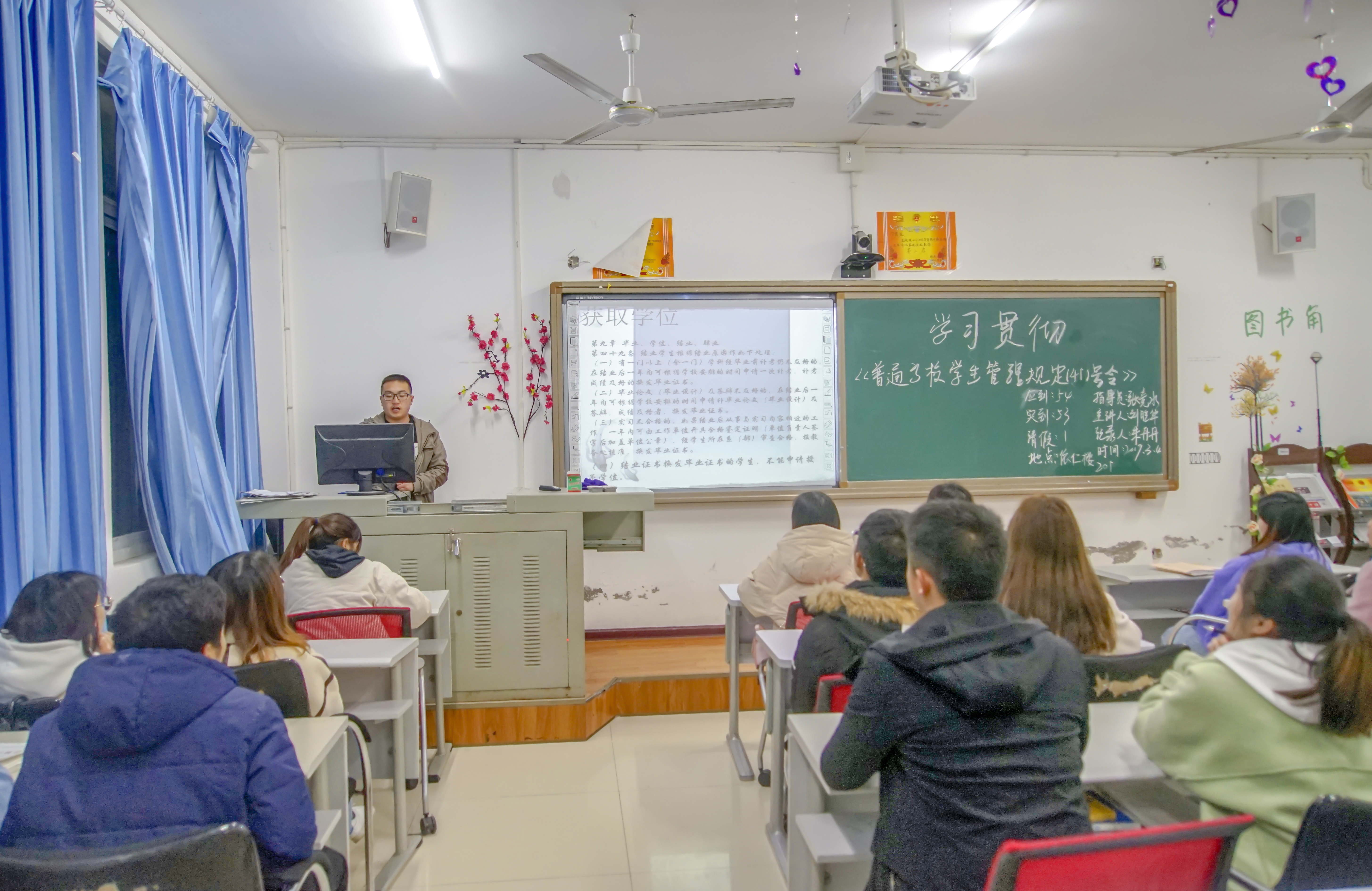 此次主题班会内容为组织学生再次深入学习《美加墨世界杯官方网站学生管理规定(试行)》、《美加墨世界杯官方网站学生违纪处分管理办法(试行)》、《美加墨世界杯官方网站学生申诉管理办法(试行)》、《美加墨世界杯官方网站学生学籍管理办法(试行)》等文件精神,重点学习有关学业预警、获取学位、违纪处分等方面的内容。该项内容作为新学期第一次班会主题,一方面是贯彻落实《普通高等学校学生管理规定》(41号令)精神的要求,另一方面也是世界杯官网严格学生管理、强化纪律意识的实际需要。