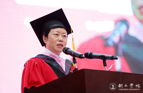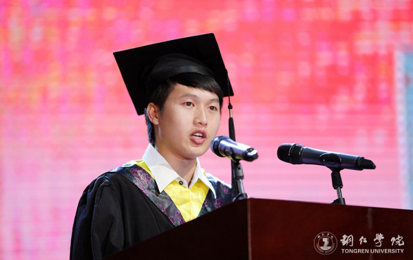 教师代表、贵州省“千层次人才”、大数据学院李勇教授,毕业生代表、人文学院张丹枫,国际学生代表宋希作了发言。在覃春江老师、张妮老师合唱的《老师您好》中,毕业生代表向教职工和家长代表献上了鲜花,表达了感恩与祝福。