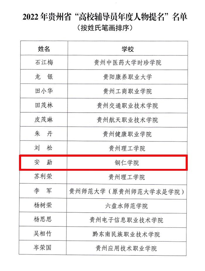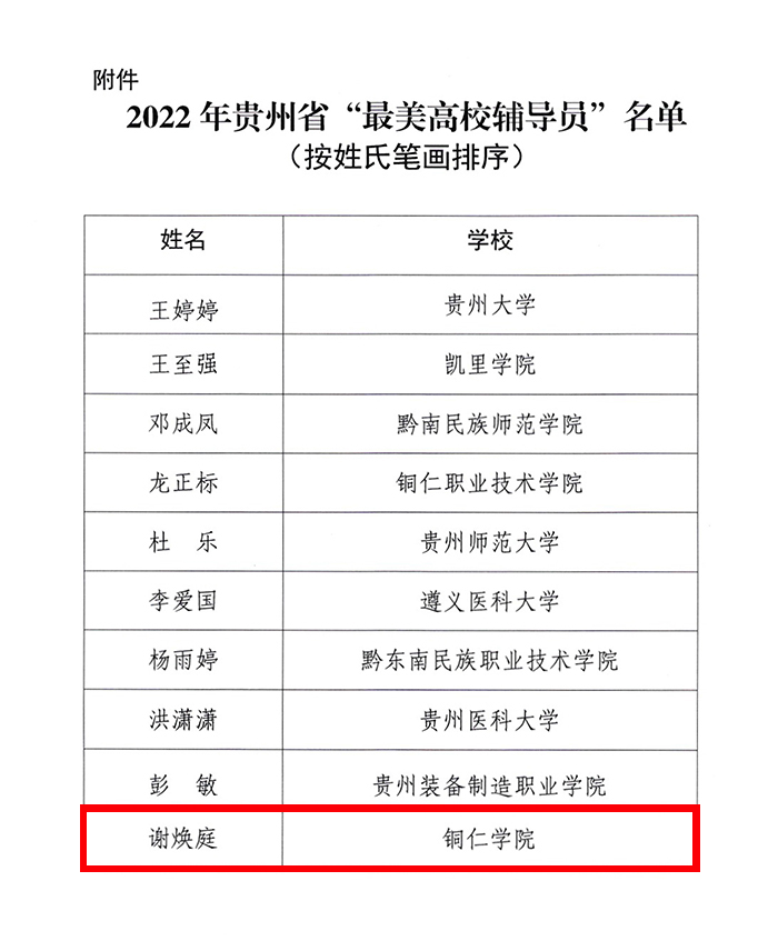 近日,贵州省教育厅下发了《关于公布2022年“最美高校辅导员”“高校辅导员年度人物”“高校辅导员年度人物提名”评选结果的通知》,世界杯官网教育学院辅导员谢焕庭入选2022年贵州省“最美高校辅导员”名单、大数据学院辅导员安勐入选2022年贵州省“高校辅导员年度人物提名”名单。