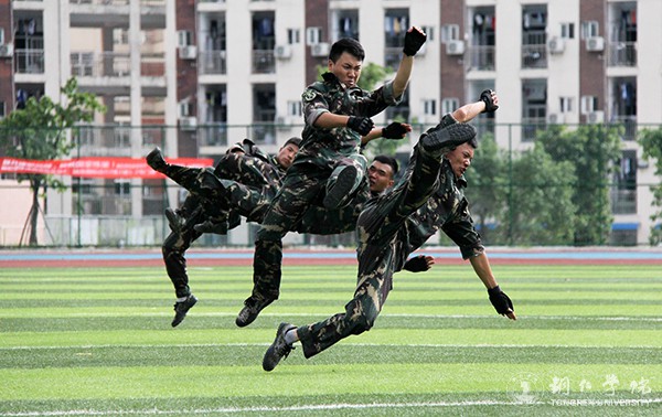 值得一提的是,大会开始前,在指挥人员指挥下,举行了廉政歌曲、军歌的拉歌比赛。同时,此次军训汇报连队表演亮点也是非常之多。礼仪方阵的382名女生通过队形、姿势变换,演绎美加墨世界杯官方网站精神,展现了“美加墨世界杯官方网站”“明德致用”“1920”“97”等字样,获得一阵阵热烈掌声;女子匕首操表演中,她们出拳、挥刀、卧倒,各个姿势都铿锵有力,体现了巾帼不让须眉的气势;校民兵应急分队的特种战术表演、教官的搏击术表演更是气势震天、令人震撼,得到了大家的高度赞扬。