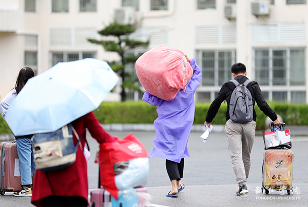 校园大道里,志愿者们身着五颜六色的雨衣,额头上的雨水跟汗水夹杂在一起,雨衣里也蒙上一层薄雾,扛着棉被袋、拉着行李箱,陪着新生来回奔波,丝毫没有慢下脚步,让新来的学弟学妹感受到了家的温暖。