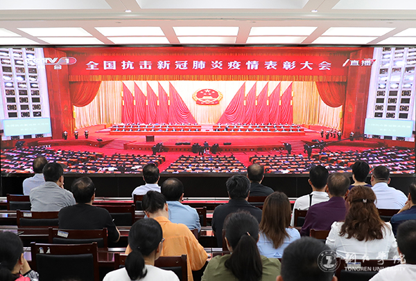 党委宣传部部长叶丹:全国抗击新冠肺炎疫情表彰大会隆重举行,习近平总书记向国家勋章和国家荣誉称号获得者颁授勋章奖章并发表重要讲话,令人振奋。疫情暴发,我们党和政府采取“世界公共卫生史上最具勇气、最为重大的举措”,领导人民打响疫情防控的人民战争、总体战、阻击战,同时积极开展国际协调和国际合作,以领世界之先、承世界之重抗击新冠肺炎疫情的卓绝行动为全球疫情防控注入源源不断的动力。中国也在此次“战疫”中,充分展示了讲信义、重情义、扬正义、守道义的大国形象与大国担当。人无精神则不立,国无精神则不强。中国是英雄的国度,中国人民是英雄的人民,中华民族是英雄的民族。中国人民在抗疫中铸就了“生命至上、举国同心、舍生忘死、尊重科学、命运与共”的伟大抗疫精神,是爱国主义、集体主义、社会主义精神的传承和发展。我们要大力宣传和弘扬伟大抗疫精神,以更大的决心、勇气与担当,为实现中华民族伟大复兴接续奋斗。