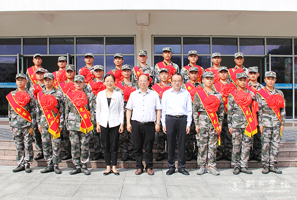 入伍新兵与校领导合影