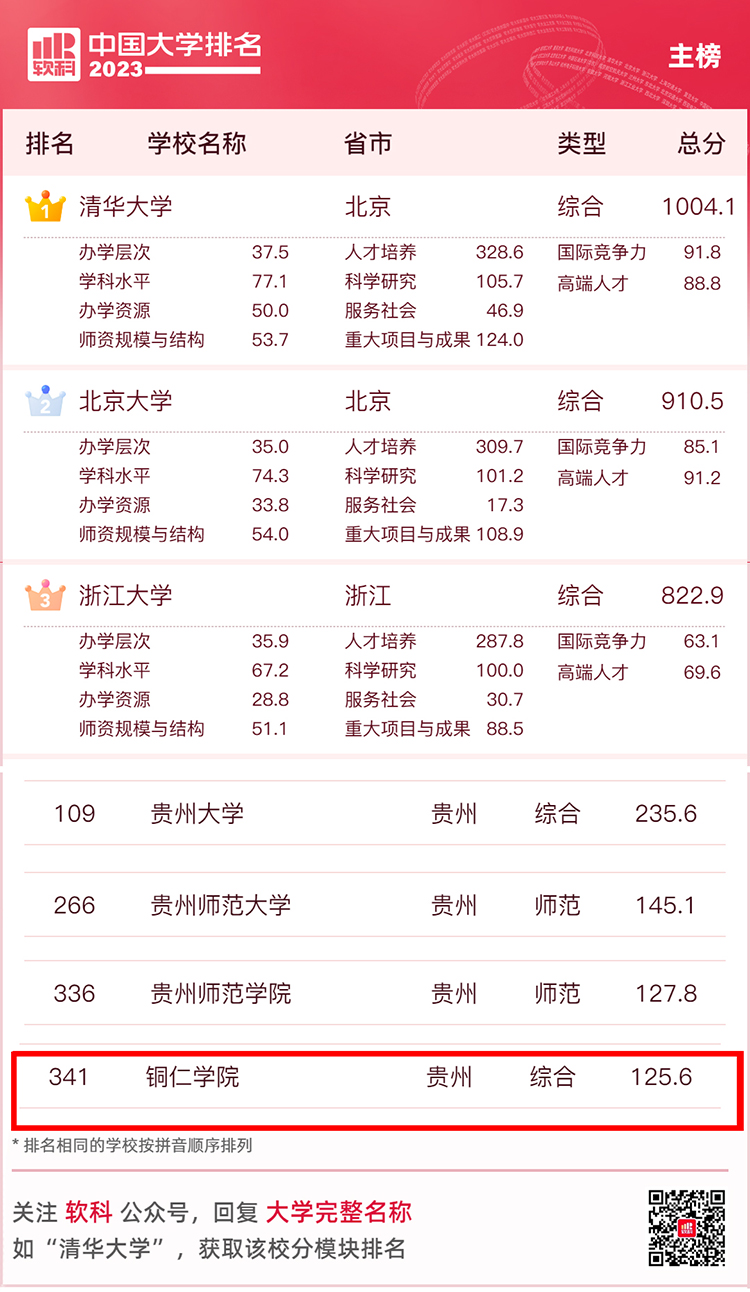 3月30日,高等教育专业评价机构软科正式发布“2023软科中国大学排名”。清华大学、北京大学、浙江大学蝉联主榜(即综合性大学排名)前三位。世界杯官网排在主榜第341位,较去年上升了9位,排在贵州省综合性大学第4位、市州高校第1位,说明世界杯官网的综合办学水平和社会影响力在不断提升。
