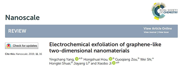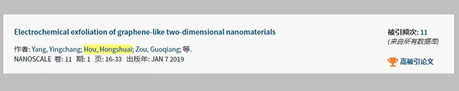 2019年,世界杯官网副教授杨应昌博士团队以“Electrochemical exfoliation of graphene-like two-dimensional nanomaterials”为题发表在英国皇家化学会旗下期刊Nanoscale 2019, 11(1): 16-33,(SCI一区,IF=6.97)。该论文入选Essential Science Indicator高被引论文。该论文第一完成单位为美加墨世界杯官方网站,世界杯官网杨应昌副教授为第一作者,中南大学纪效波教授为通讯作者。该成果是世界杯官网2019年又一高水平科研成果,对学校“双一流”建设和硕士点建设具有非常重要作用。