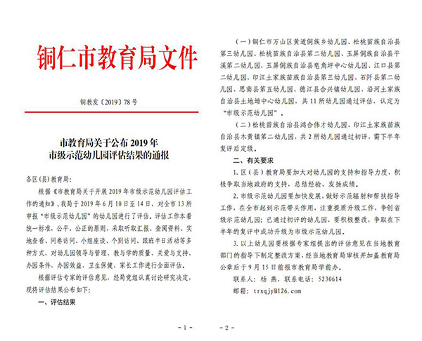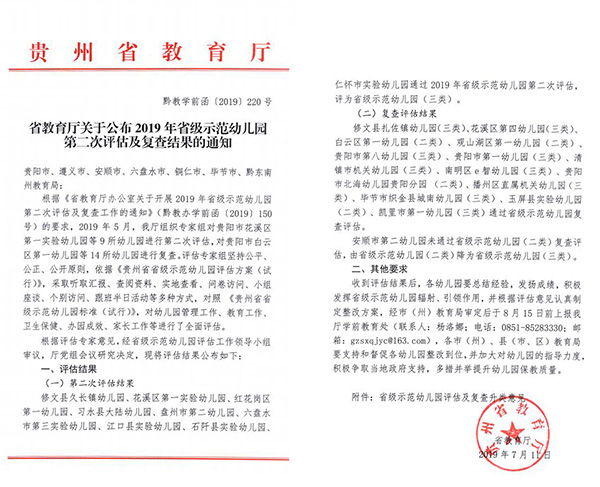 日前,贵州省教育厅、铜仁市教育局先后公示了2019年贵州省省级示范幼儿园、铜仁市市级示范幼儿园评估结果,世界杯官网学前教育专业社会服务团队所指导的江口县实验幼儿园、石阡县实验幼儿园顺利通过贵州省省级示范幼儿园评估,松桃县第二幼儿园、第三幼儿园顺利通过铜仁市市级示范幼儿园评估。