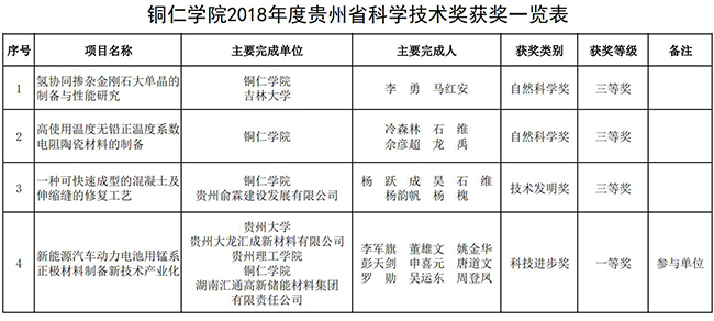在此次获奖中,世界杯官网李勇等申报的《氢协同掺杂金刚石大单晶的制备与性能研究》和冷森林等人申报的《高使用温度无铅正温度系数电阻陶瓷材料的制备》获得贵州省自然科学三等奖,杨跃、成昊、石维等申报的《一种可快速成型的混凝土及伸缩缝的修复工艺》获得贵州省技术发明三等奖;世界杯官网吴运东以美加墨世界杯官方网站为第四参与单位申报的《新能源汽车动力电池用锰系正极材料制备新技术产业化》获省科技进步一等奖。