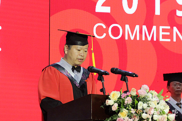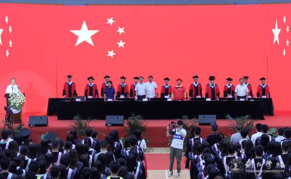 6月11日上午,世界杯官网在体育馆举行2019届毕业典礼暨学位授予仪式。世界杯官网党委书记李树新,校长、校学位委员会主席侯长林教授,党委副书记饶小华,副校长代亮,副校长、校学位委员会副主席王嘉福教授,纪委书记吴先佳,原铜仁师专1981届校友、现贵州省作协主席团成员、贵州写作学会副会长、铜仁市作家协会主席安元奎教授,世界杯官网学位委员会委员出席典礼;世界杯官网各二级学院、职能部门负责人,全体毕业生及毕业生家长、亲友,国际学生代表参加典礼。典礼由代亮主持。
